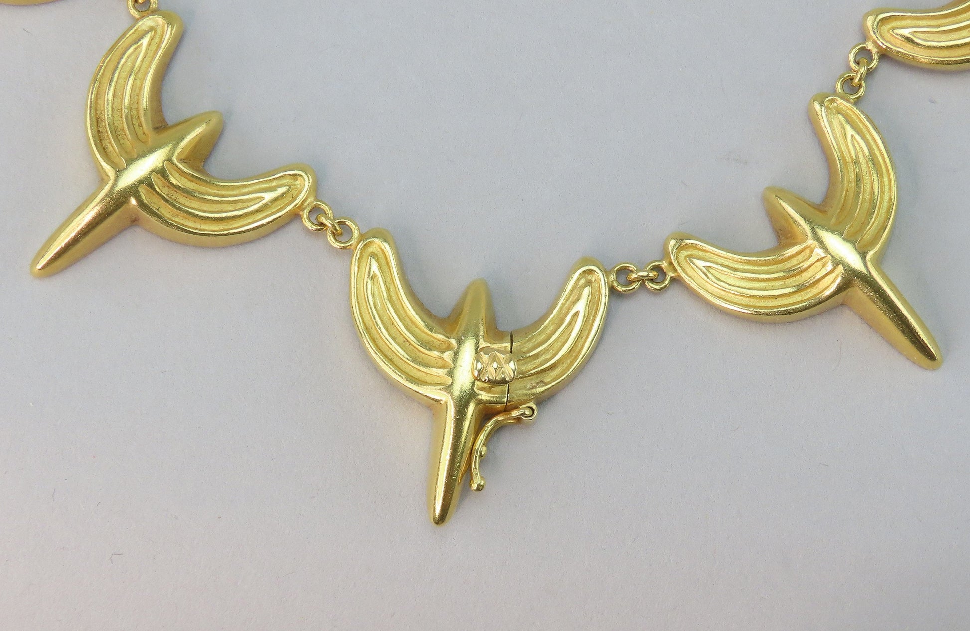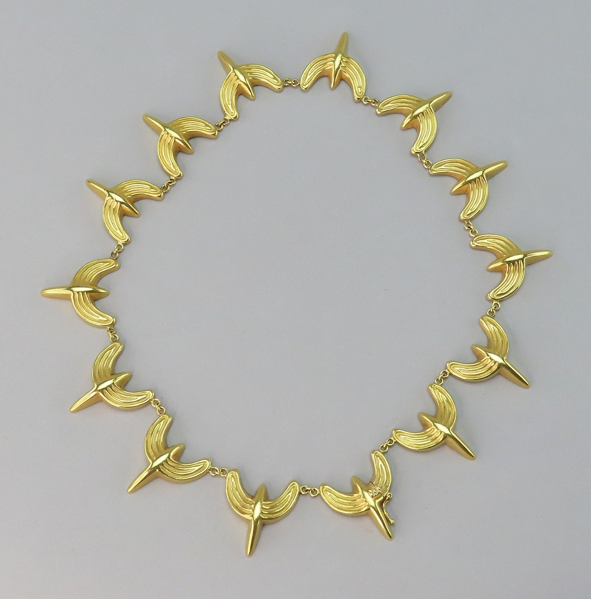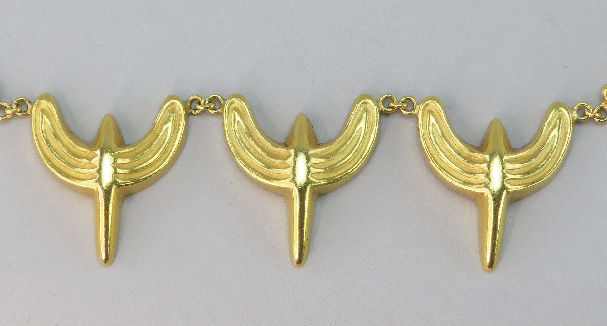 Presented is a fabulous signed Lalaounis 22 karat yellow gold necklace. This necklace comes with its original suede presentation pouch and box, and this box even has a full color Lalaounis jewelry pamphlet inside. The necklace consists of handwrought 22 karat gold links in a stylized winged shape, with a very antiquities inspired Hellenic design. The necklace has an 'invisible' style tab insert clasp, with a safety latch on one side. The interior pamphlet gives the names of several Lalounis collections or themes, including Neolithic, Minoan, Classical, and Themes of Mythologie, Symbols and Byzantium, and with its almost winged or horned design, this necklace may well be part of the Minoan collection itself. Whatever the case, this is an incredibly striking, fantastically well constructed piece of jewelry unmatched by anything on the market today.