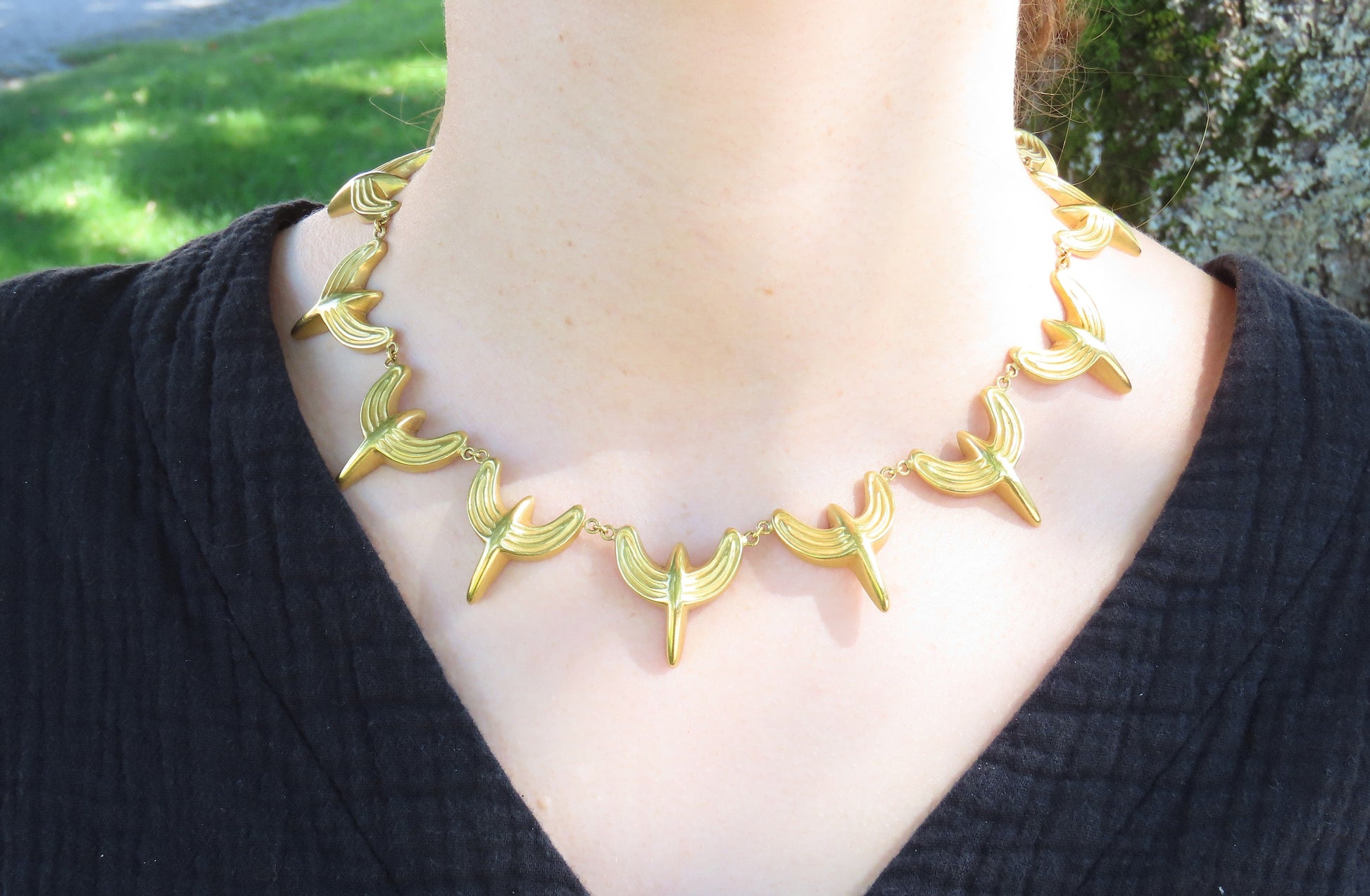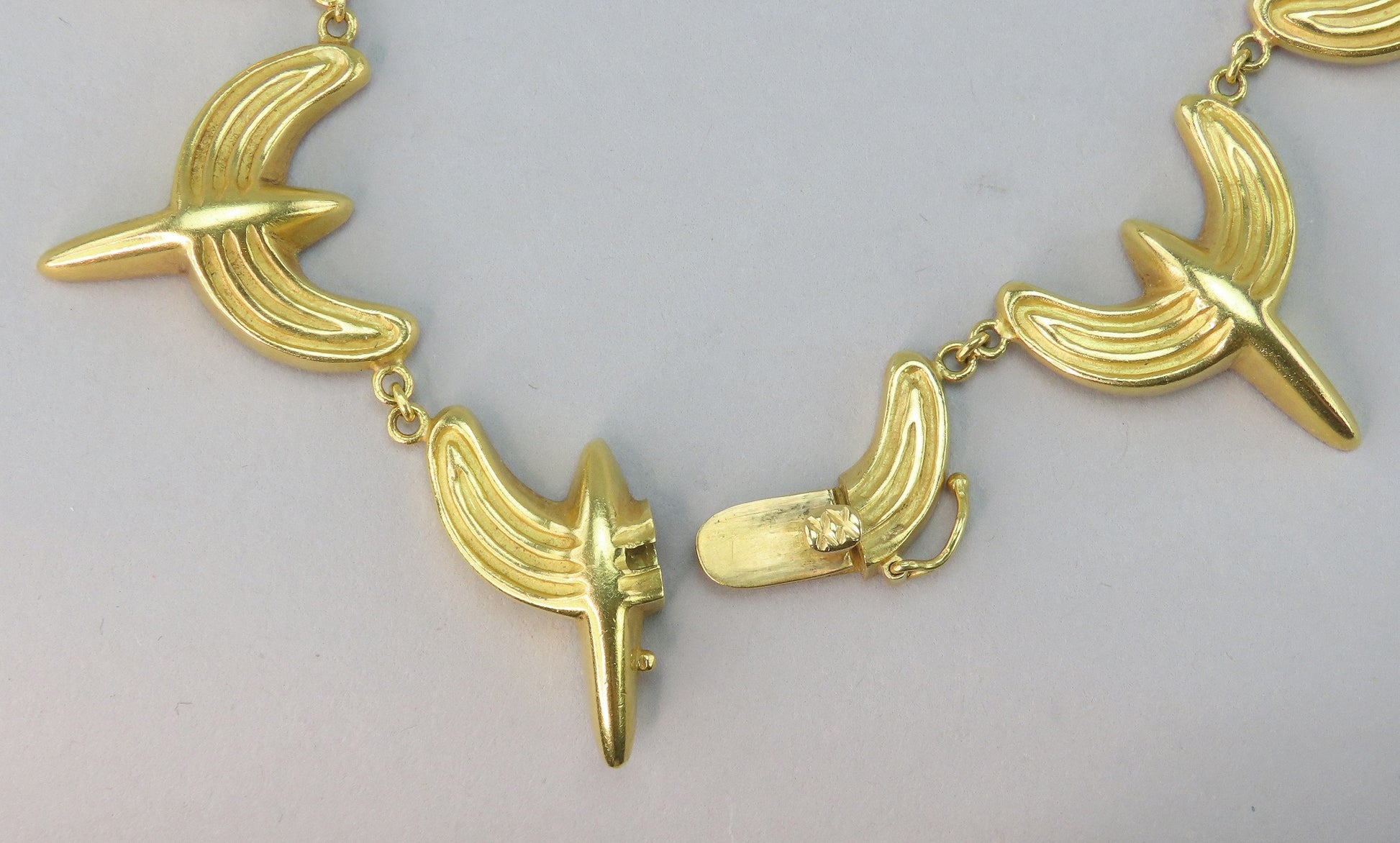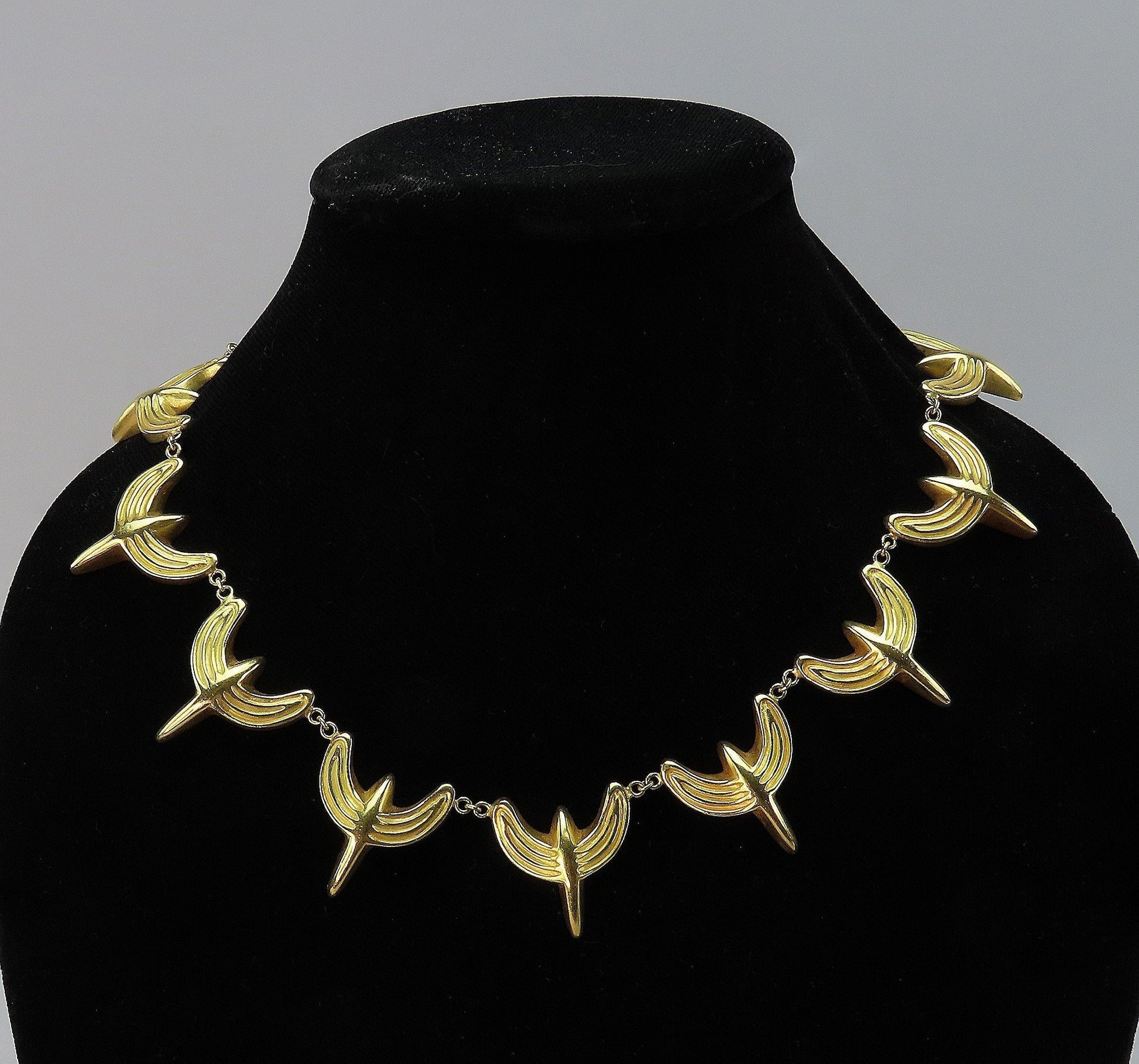 Presented is a fabulous signed Lalaounis 22 karat yellow gold necklace. This necklace comes with its original suede presentation pouch and box, and this box even has a full color Lalaounis jewelry pamphlet inside. The necklace consists of handwrought 22 karat gold links in a stylized winged shape, with a very antiquities inspired Hellenic design. The necklace has an 'invisible' style tab insert clasp, with a safety latch on one side. The interior pamphlet gives the names of several Lalounis collections or themes, including Neolithic, Minoan, Classical, and Themes of Mythologie, Symbols and Byzantium, and with its almost winged or horned design, this necklace may well be part of the Minoan collection itself. Whatever the case, this is an incredibly striking, fantastically well constructed piece of jewelry unmatched by anything on the market today.