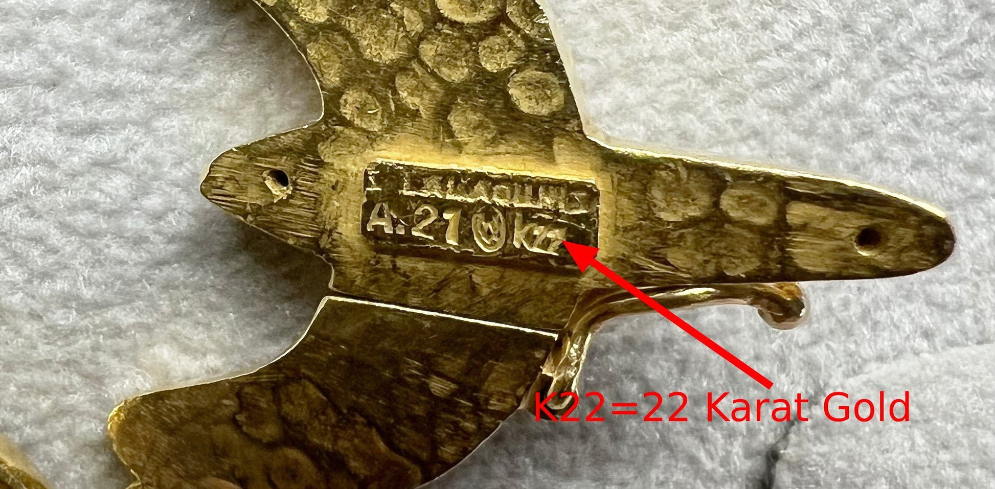 This piece is stamped on the clasp with the maker's mark for Lalaounis as well as K22 for 22 karat gold.