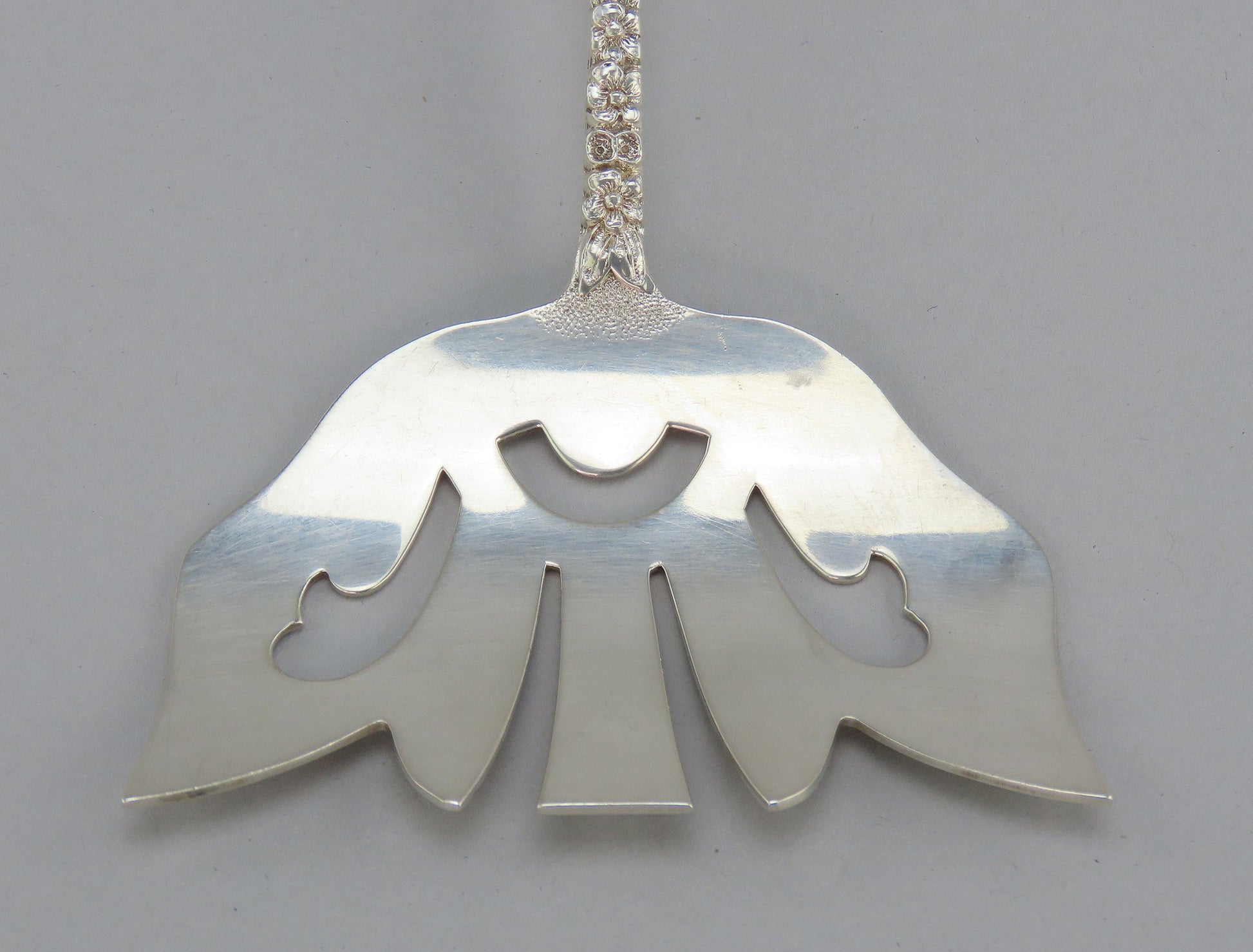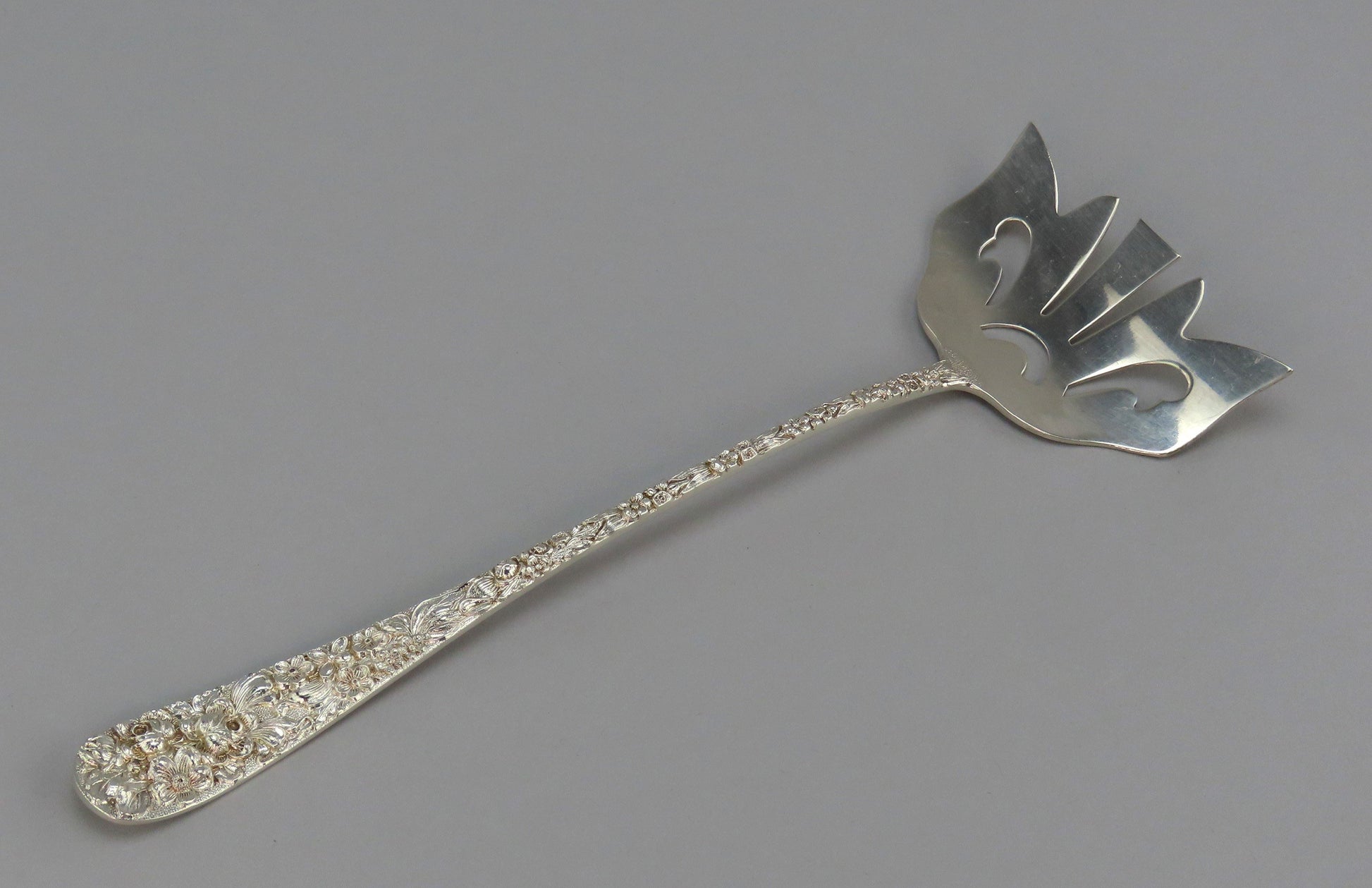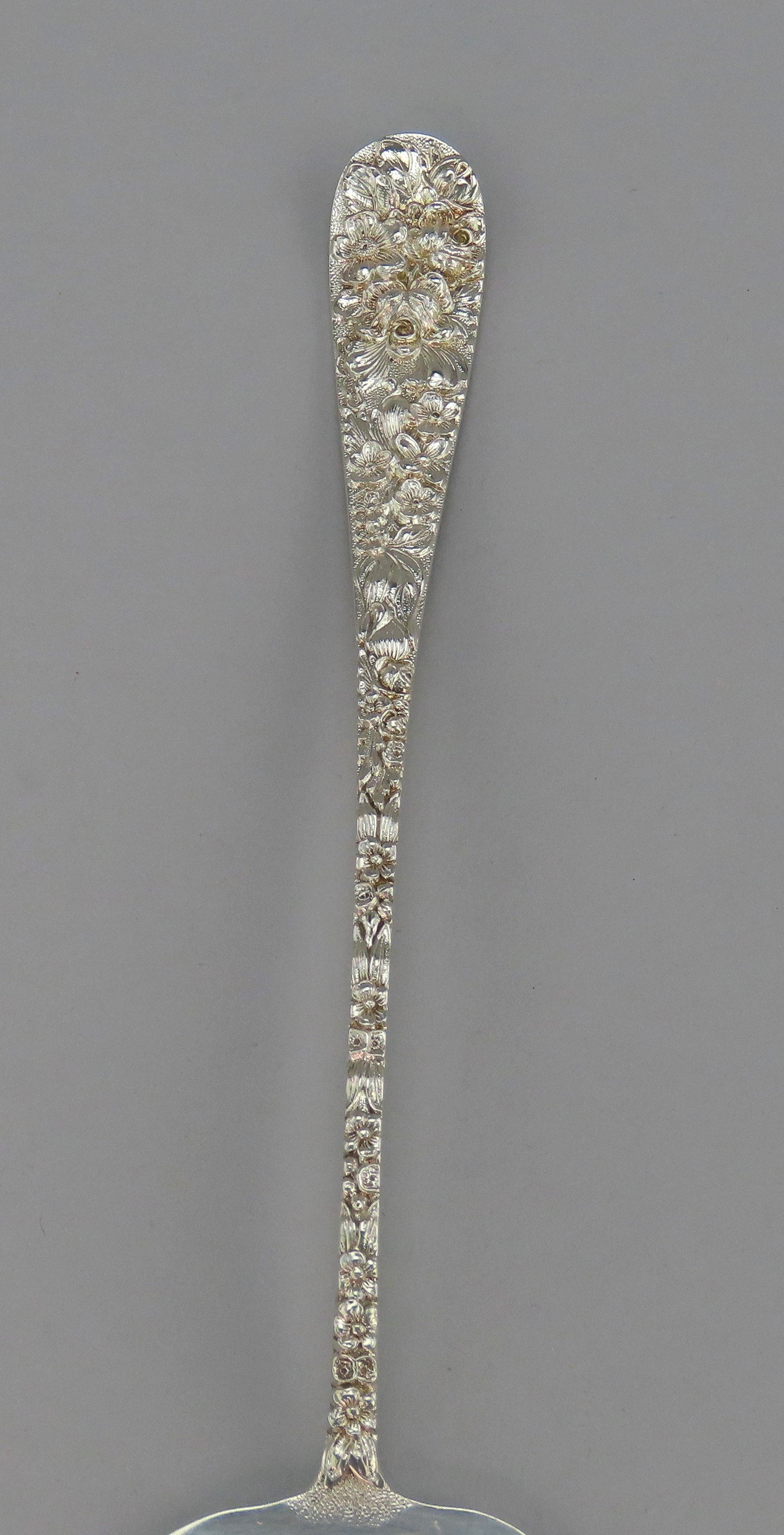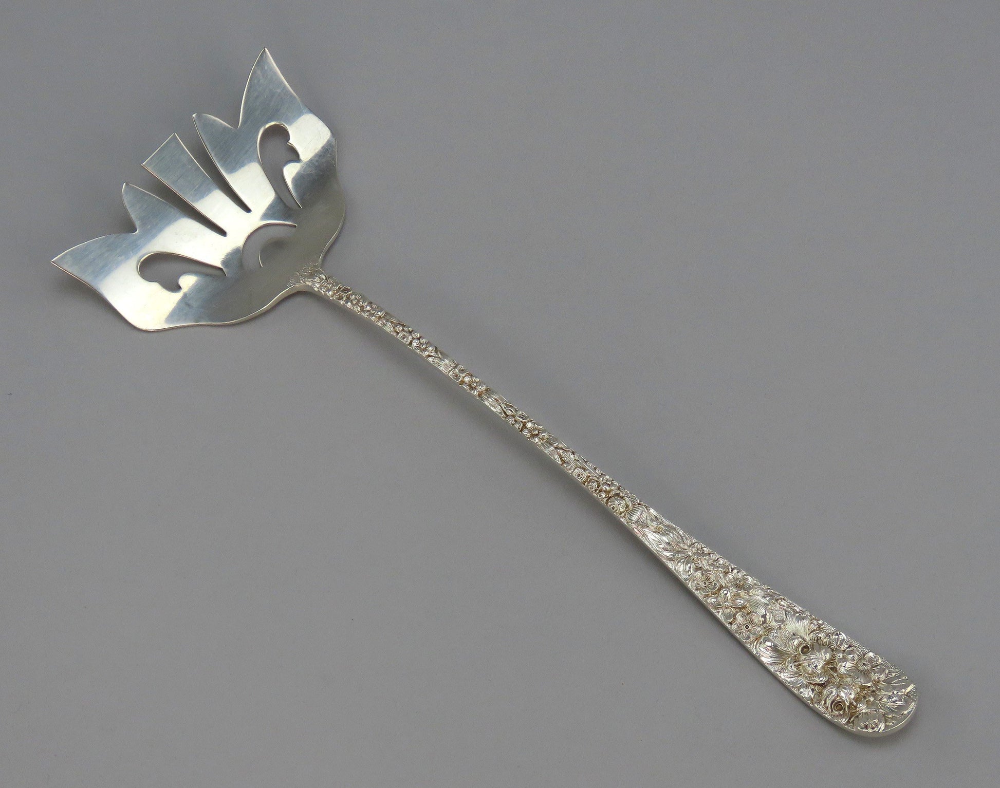 Presented is an interesting sterling silver long bacon serving fork by Stieff. This piece is in the Stieff Rose pattern, which was patented in 1892. The piece has a wide short serving end with the classic Steiff Rose high relief floral pattern. There is a monogram, M, on the reverse in a flowing script.