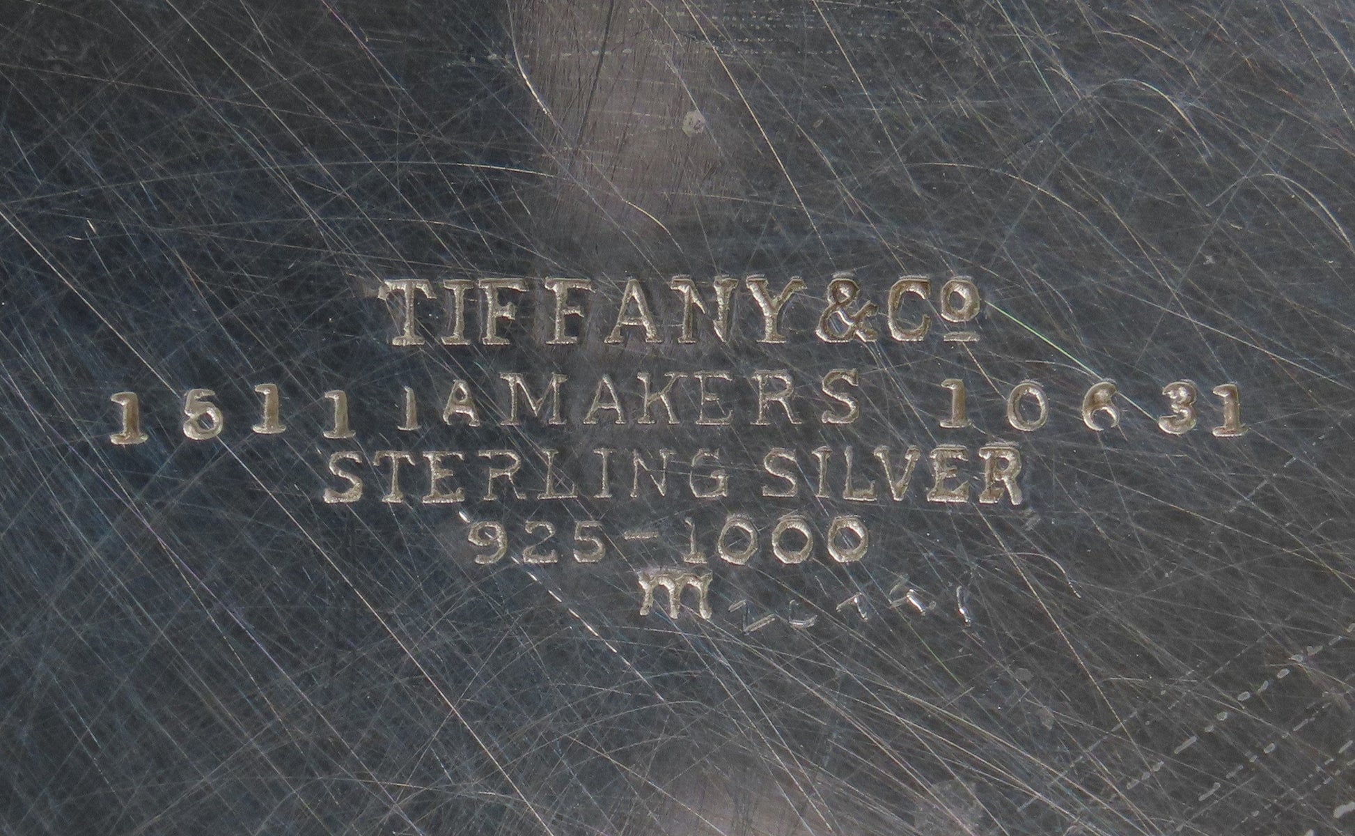 This piece is stamped with the Tiffany & Co maker's mark, sterling, and the initial 'm' for the director of the company between 1907-1947, John C. Moore II.
