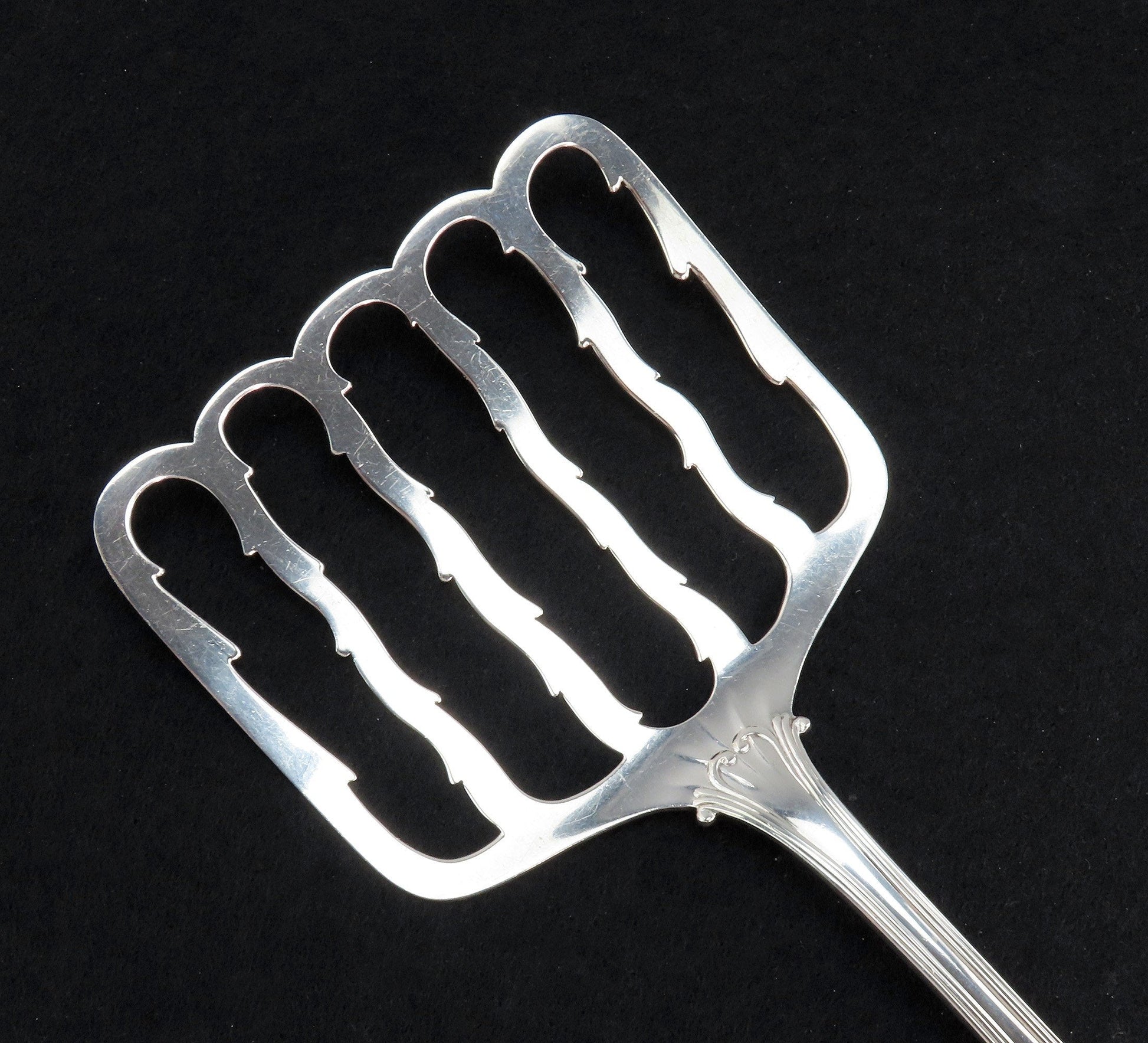 Presented is a handsome and quite rare sterling silver toast server from Towle, although this piece could certainly be used as an asparagus server. This piece is in the Paul Revere pattern, which was patented in 1906. The pattern displays a nice threaded edge and fluted top. The serving end has wide piercing with small scroll details. The front of the handle has been monogrammed AR in a flowing script.