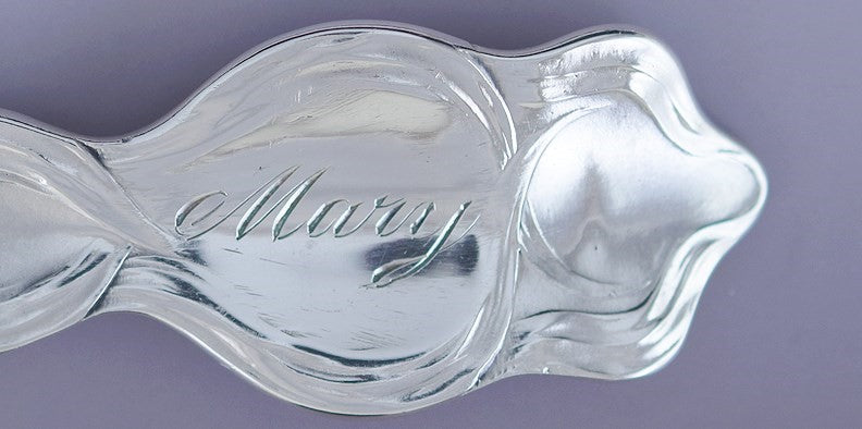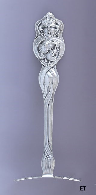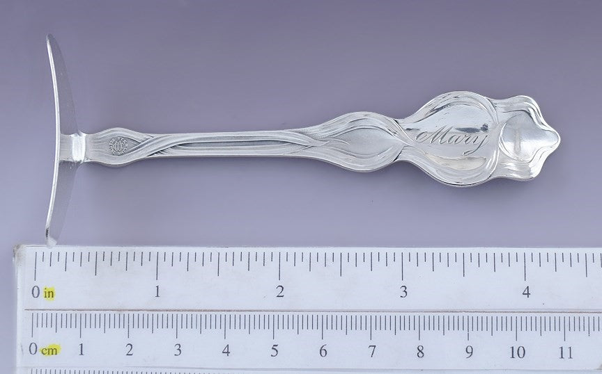 Presented is a lovely Unger Brothers sterling silver baby food pusher. This piece is made in the Cupid Sunbeams pattern, which began production in circa 1904. This pattern features a design of two little cherubs, done in a flowing, detailed Art Nouveau style. The baby food pusher has a monogram of Mary on the back of the handle. This is a rare, old piece, and highly collectible.