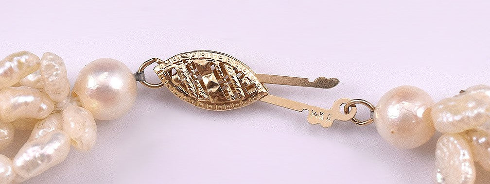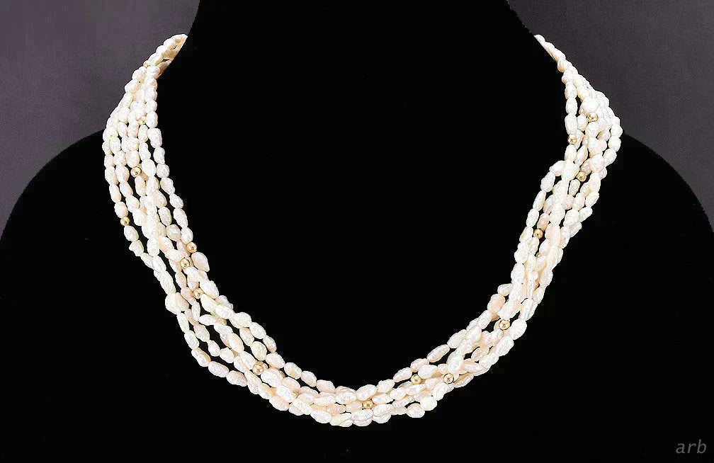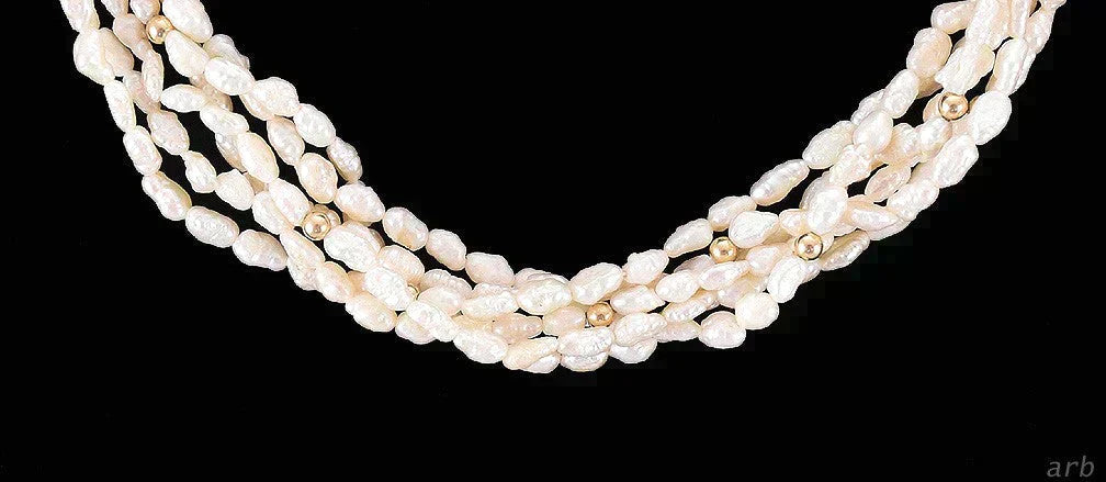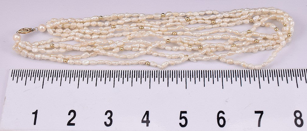 Regal 6 Strand Freshwater Pearl Necklace, 14K Yellow Gold Beads, Filigree Clasp