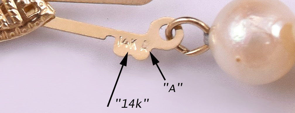 The filigree yellow gold safety clasp is stamped "14K" for gold purity.