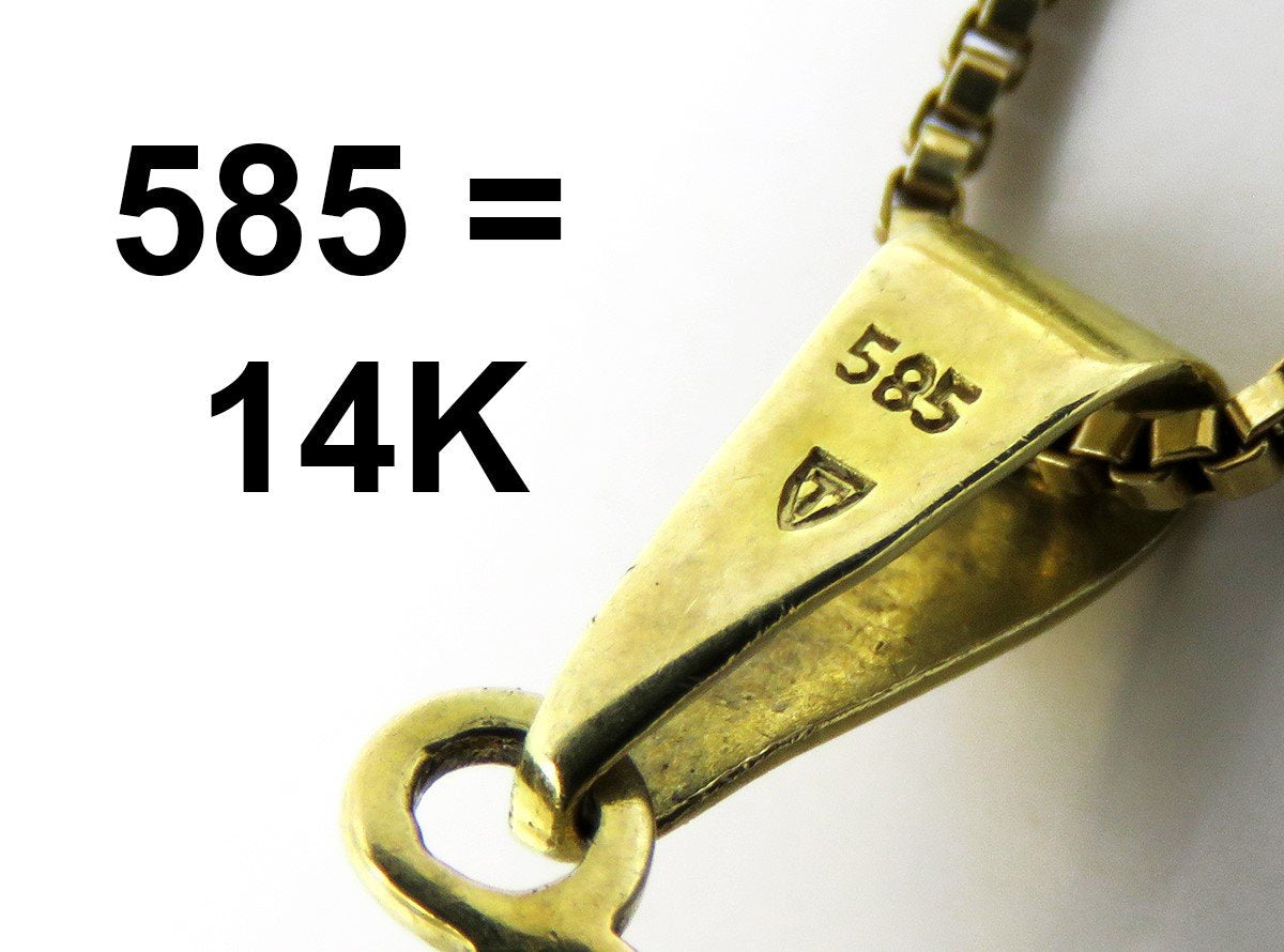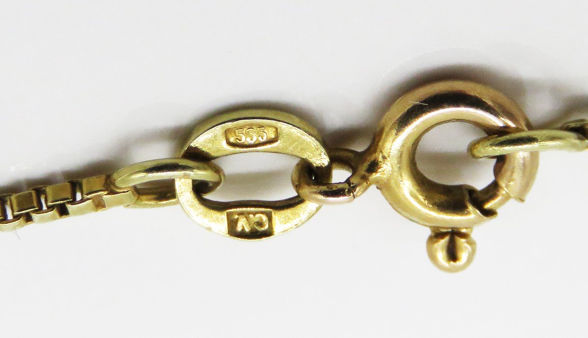 Both the chain and the pendant are nitric acid tested and guaranteed 14 karat gold as well as a maker's mark.