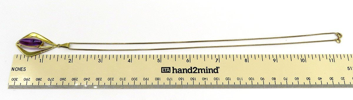Presented is a lovely 14 karat yellow gold and amethyst pendant necklace. This is a relatively contemporary piece, likely of American make. The chain is a classic box style. The pendant is set with a gorgeous purple amethyst cabochon measuring about 21 by 8 millimeters, in a decorative openwork setting. The pendant has a good size bail of about 8.5 by 3 millimeters interior measurement so it can accommodate other sizes and styles of chain as well.