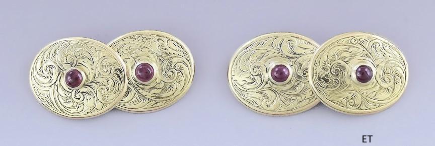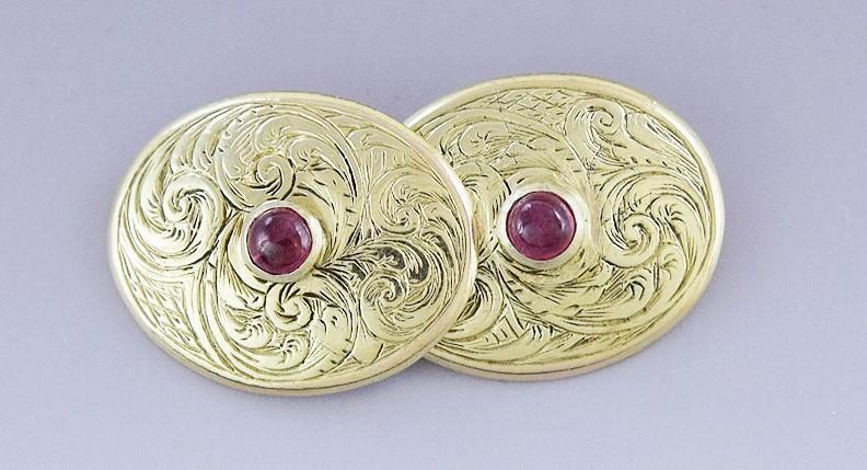 is done as two oval buttons, finely hand engraved with rich foliate scrollwork.