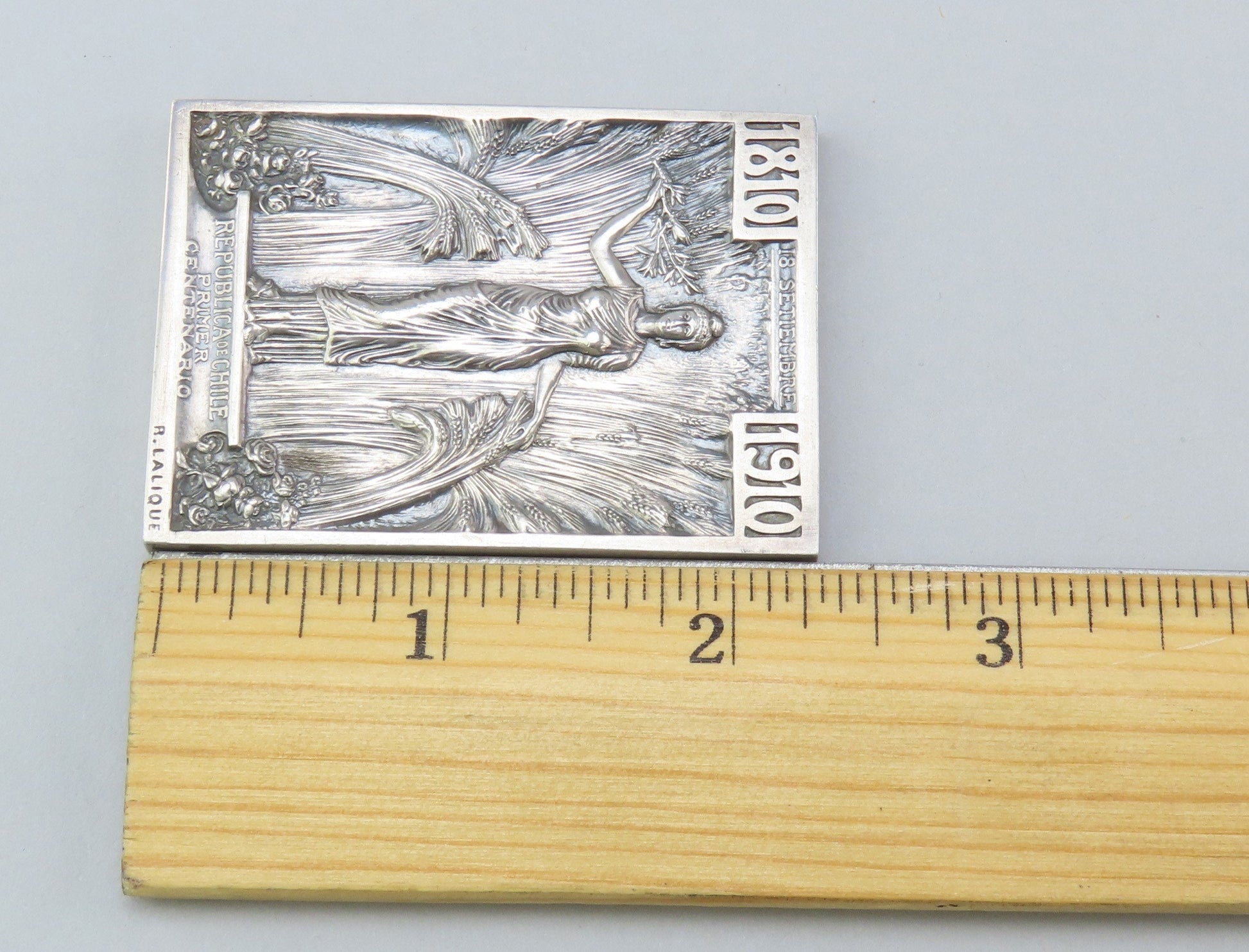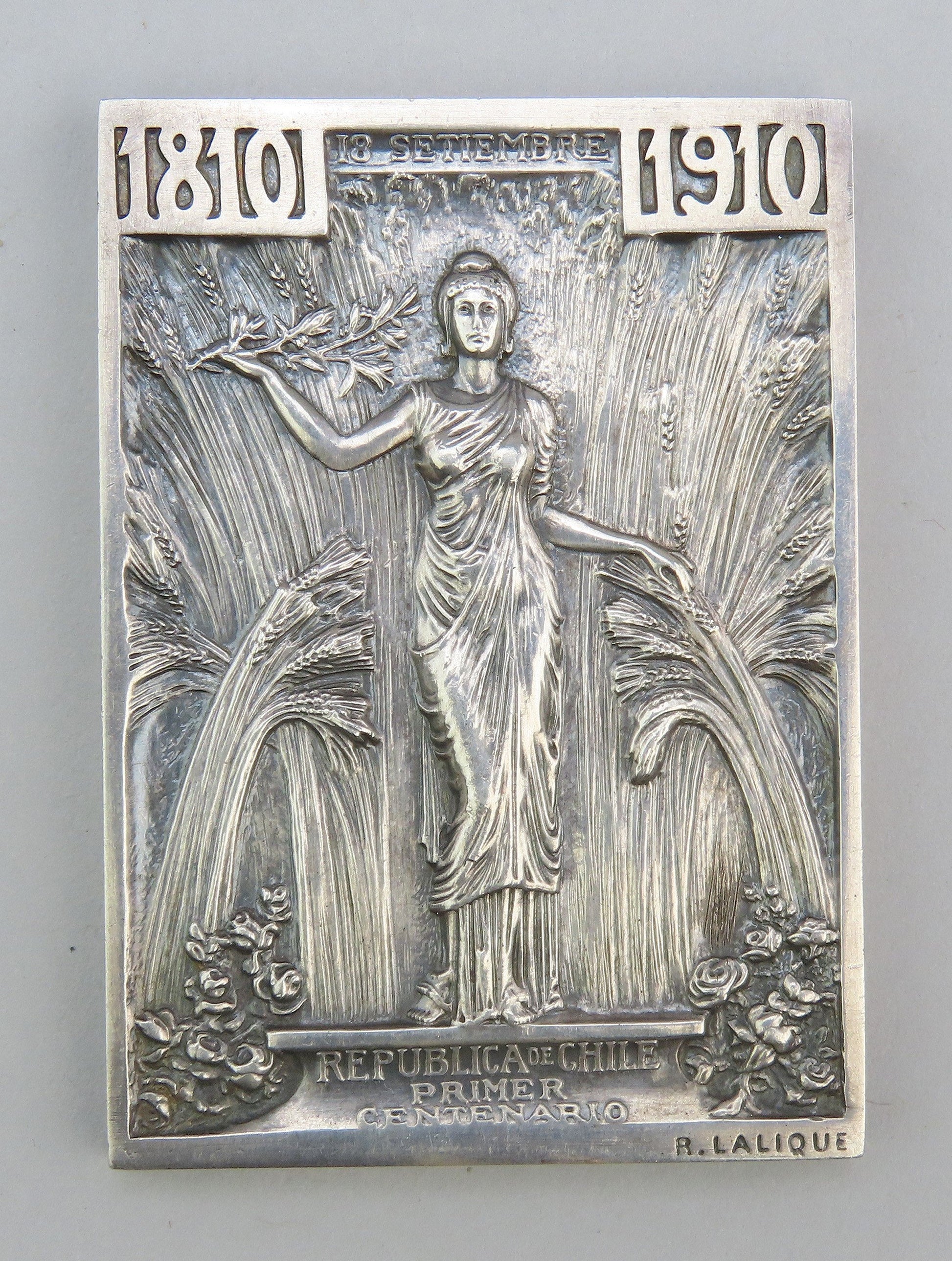 Presented is a fantastic quality silver plaque or medal commemorating the first centennial of the Republic of Chile, by Rene Lalique. The face of the plaque depicts a woman standing on a plinth, holding a branch and surrounded by tall sheafs of wheat and rose bushes. At the top are the dates 1810 and 1910, with “18 Setiembre” between. The reverse shows a mountainous landscape, with the flag of Chile in the foreground, a firework exploding behind and the coat of arms for Chile beneath. All the work is exceptionally detailed and well cast, very crisp and faithful as you'd expect for Lalique. In our research we found other examples of this medal which were significantly less detailed, with substantially lower quality casting, presumably repros or re-issues; this is not such a piece, it is original and very high quality. The medal is solid and quite heavy, about 4.5 millimeters thick. Please note, we also have the bronze version of this medal for sale, which you can find by searching “Chile” in our storefront.