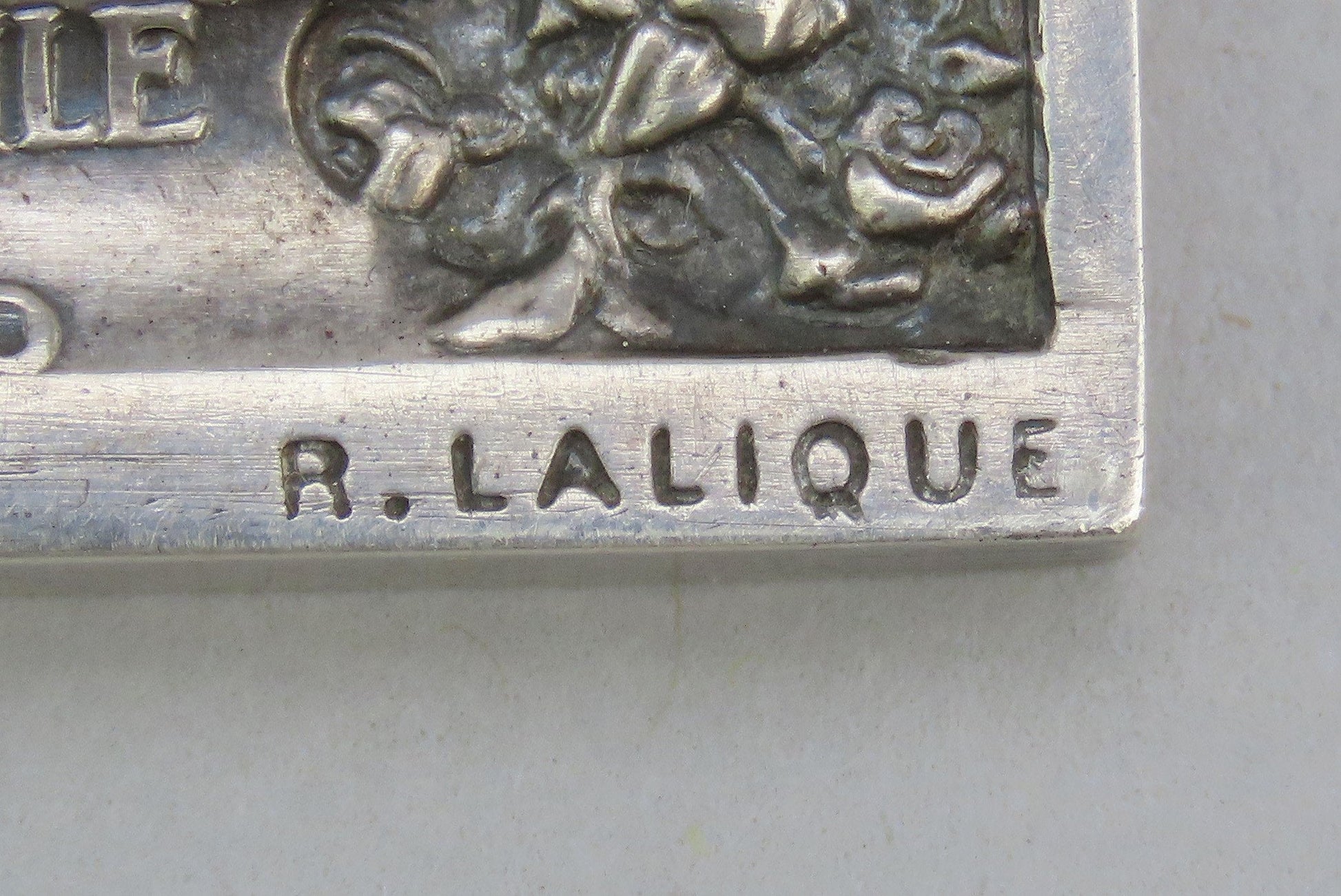 The front of the plaque is signed R. Lalique, in the lower righthand corner. Along the bottom edge is a stamp of ARGENT, for silver, and two small hallmarks. This piece is nitric acid tested and guaranteed high purity silver (at least 925), we believe it to be 950 purity, French 1st standard, since it is a French made piece.