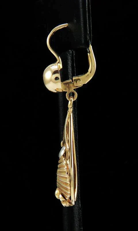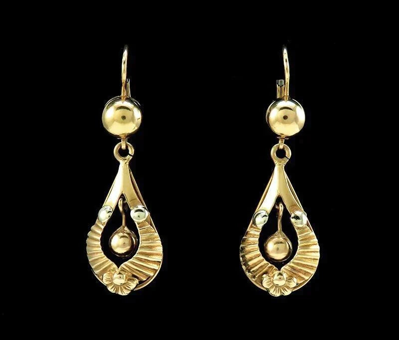 Retro Style Pair 18K Yellow & White Gold Dangle Earrings Flower Accents