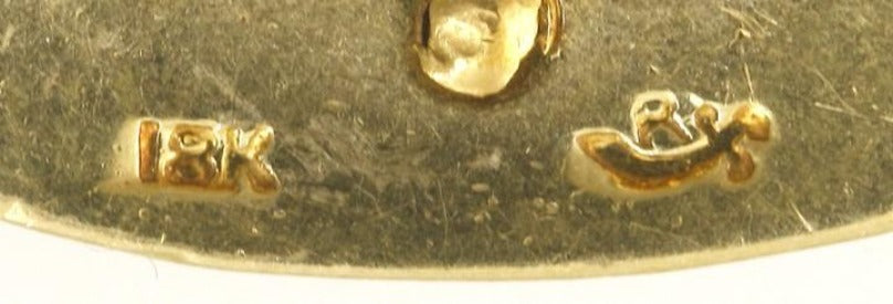 The cufflinks are stamped with the maker’s mark for Riker Brothers and 18K. We have tested them with nitric acid and guarantee them to be 18K gold. We have also tested the scimitar and guarantee it to be platinum.