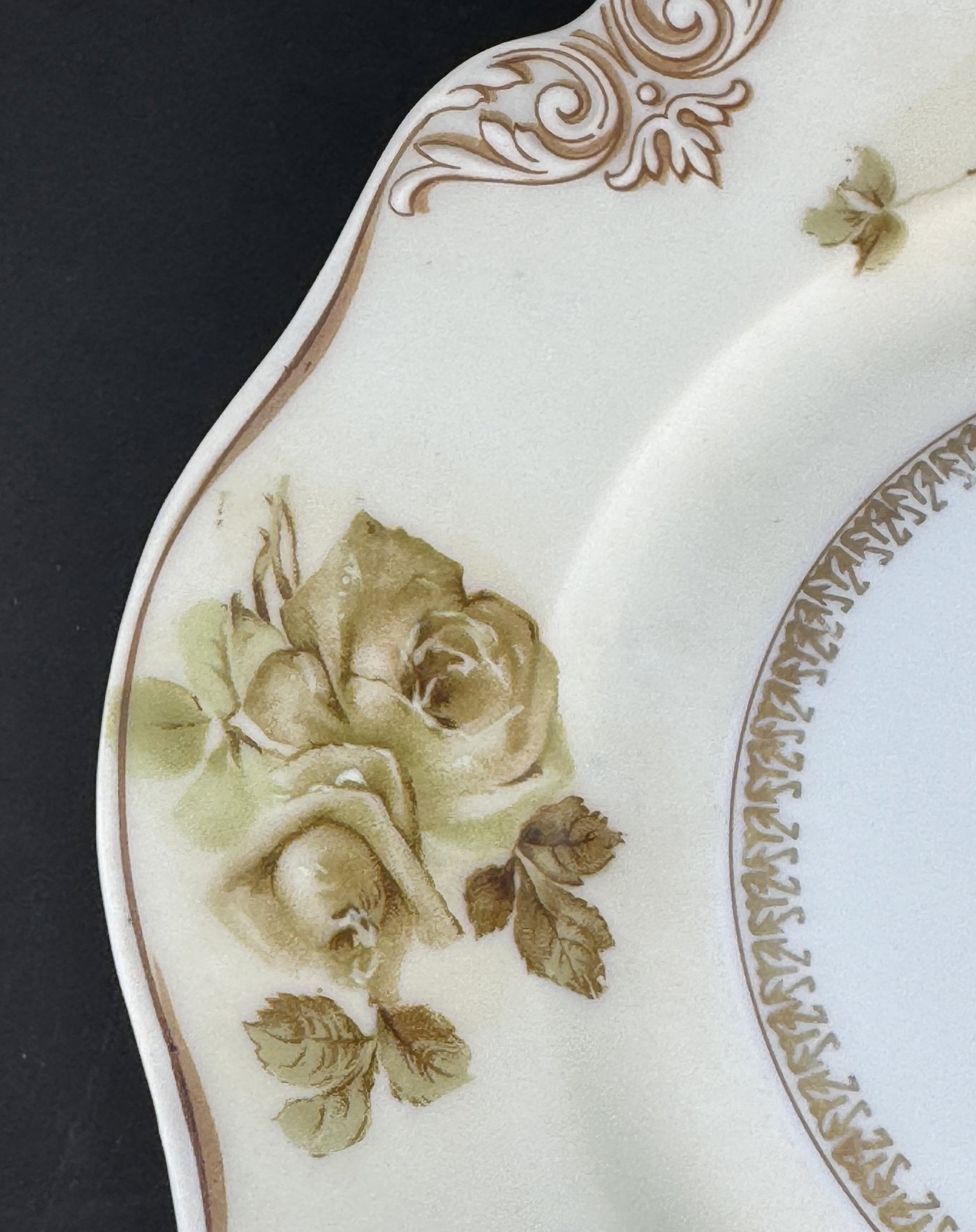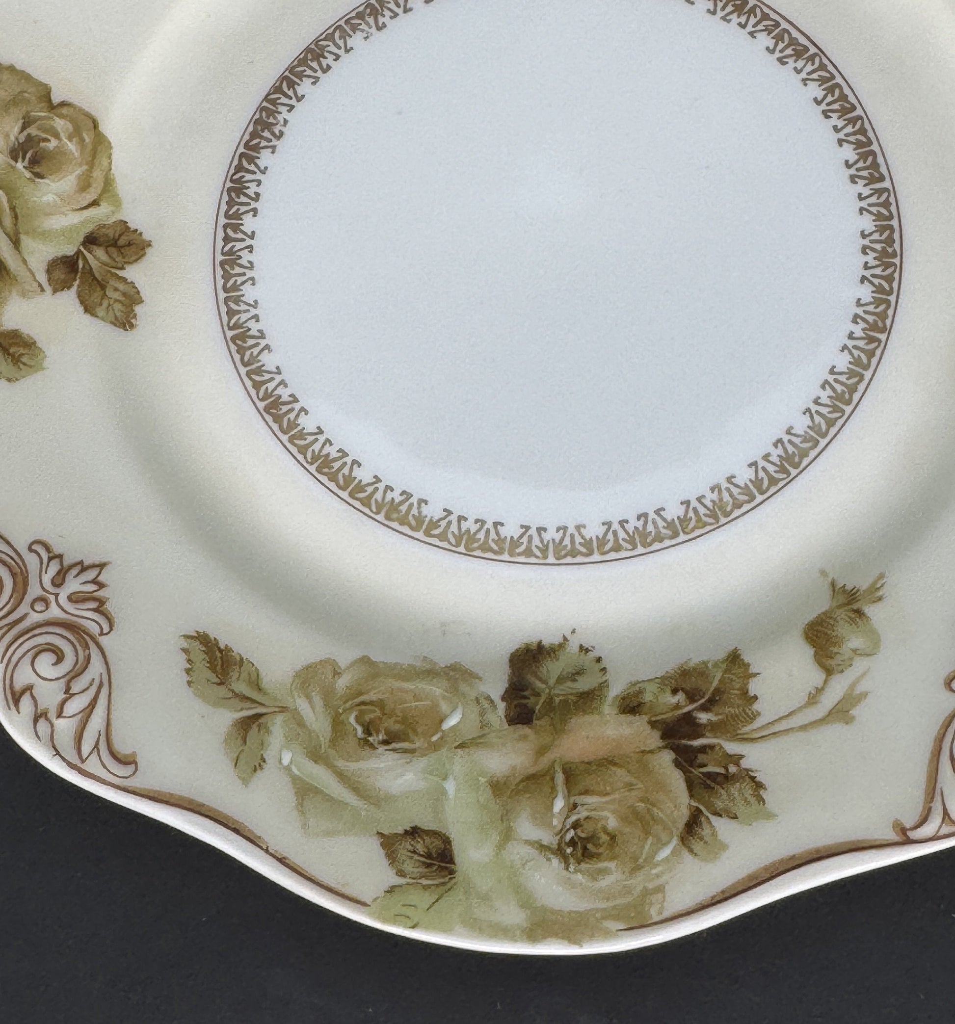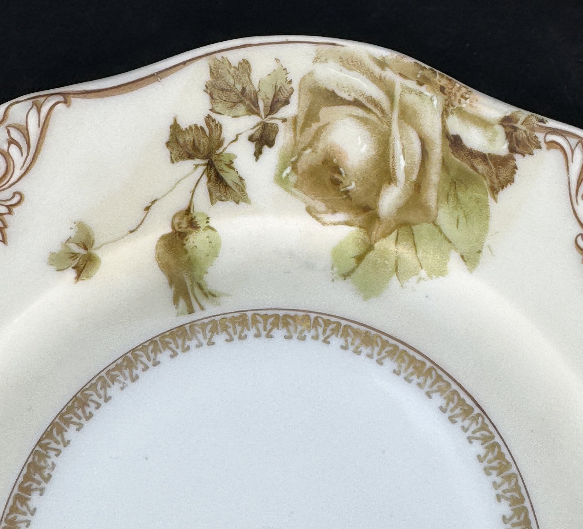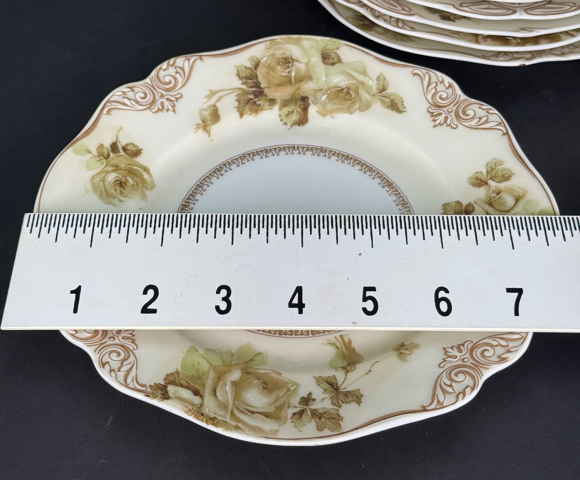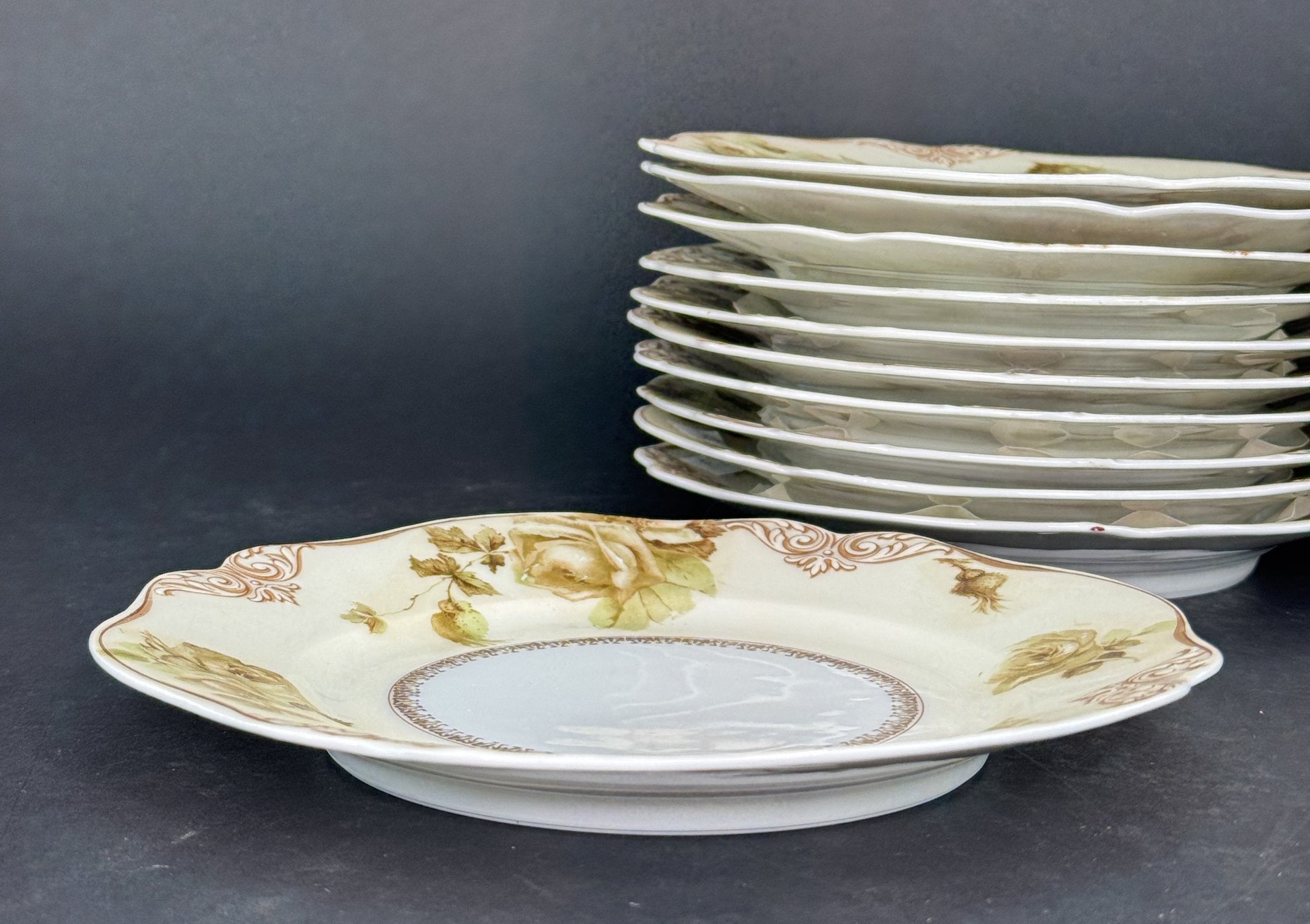 Presented is a fine quality set of 11 Herman Ohme, Silesia porcelain plates, dating to around the first quarter of the 1900s. This set is made in the Old Ivory line, and features lovely decoration of roses and leaves against a mellow ivory color background. These plates are a good size for dessert or salad plates, though of course you can use them however you like. Please note, we have many additional pieces in this pattern, which you can find by searching “Old Ivory” in our store.
