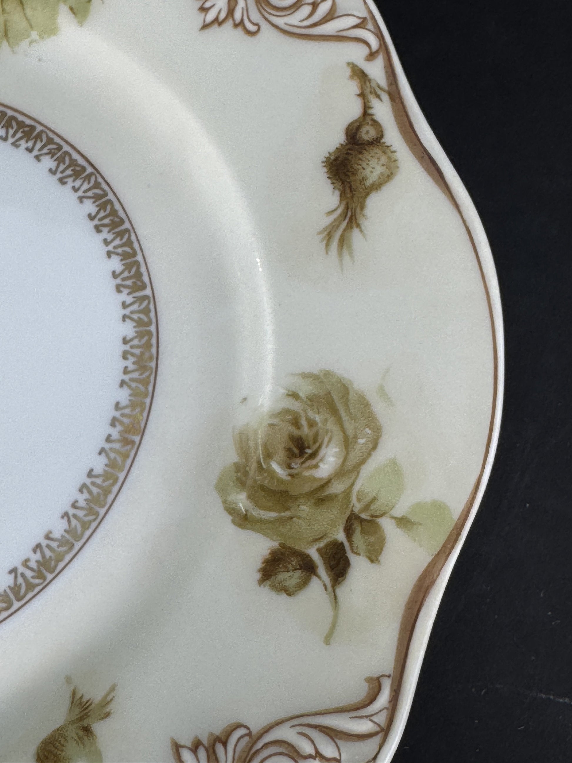 This set is in great overall condition. The gilding is in great shape on most, but some have very minor wear to the gilding around the interior, as you see from plates being stored in a stack. There are no chips, no cracks, no breaks, and no repairs.