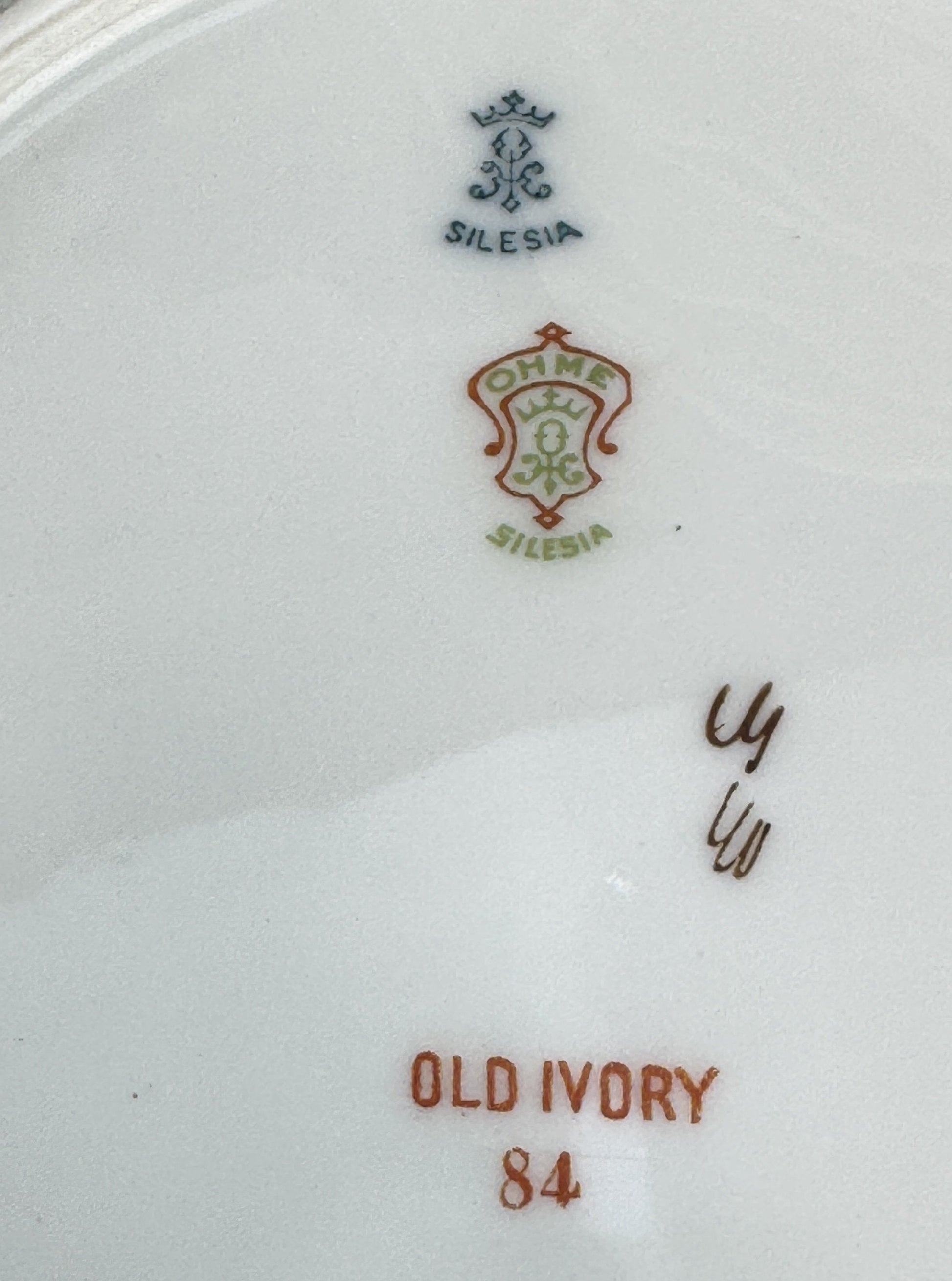 The underside of each is signed for Hermann Ohme, Silesia Poland, the pattern name Old Ivory. Mostly the plates have the number 16, but some may have 84 or no number.