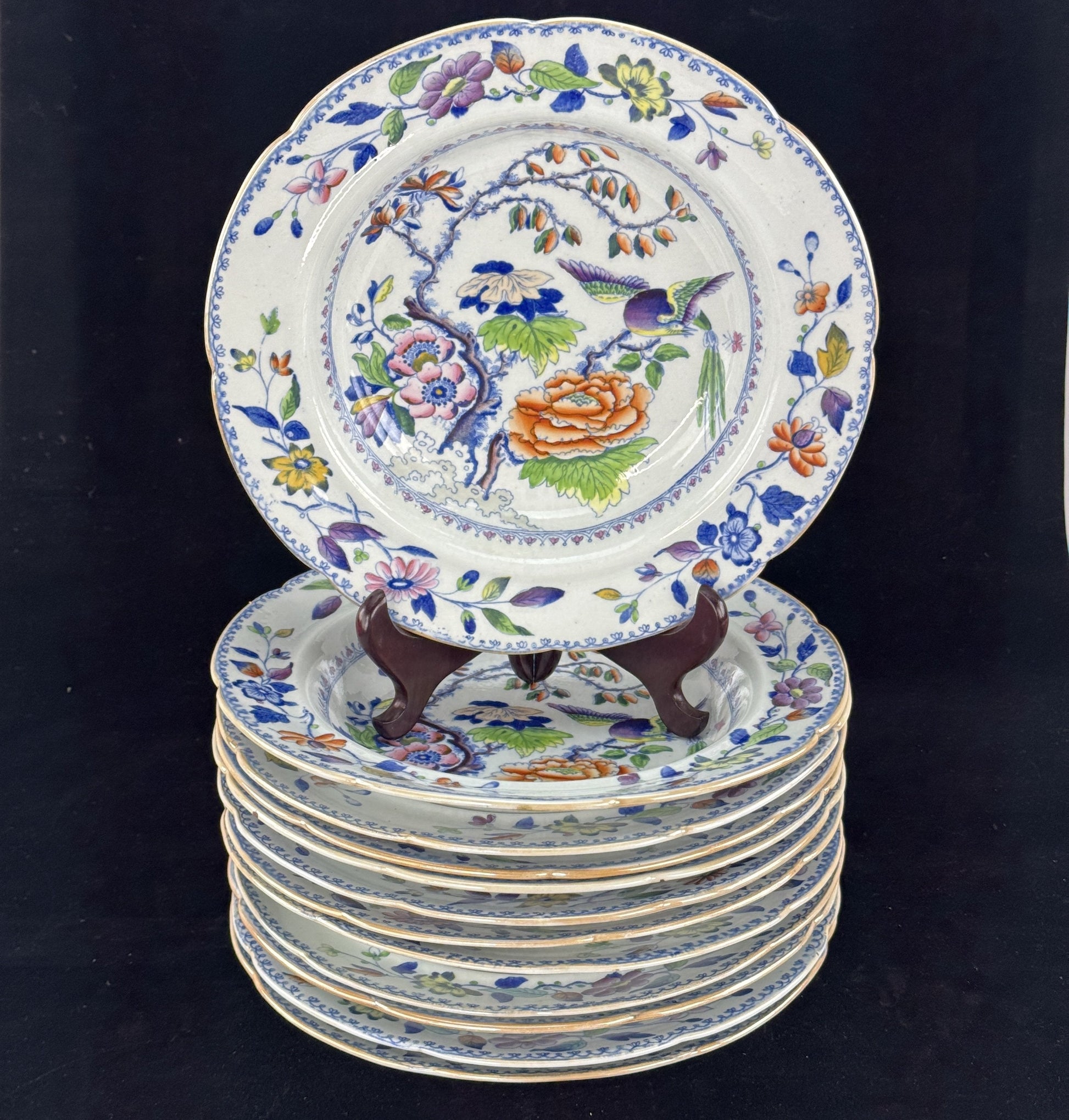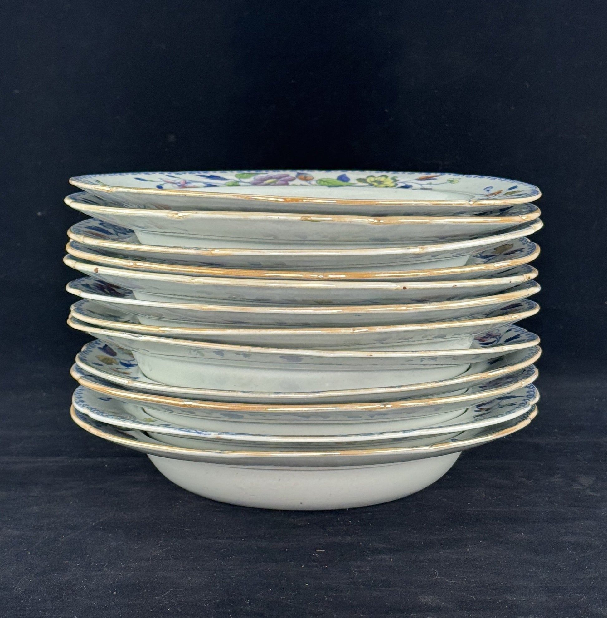 Set 12 c1815 Georgian English Davenport Flying Bird Wide Rim Soup Bowls 9.5"
