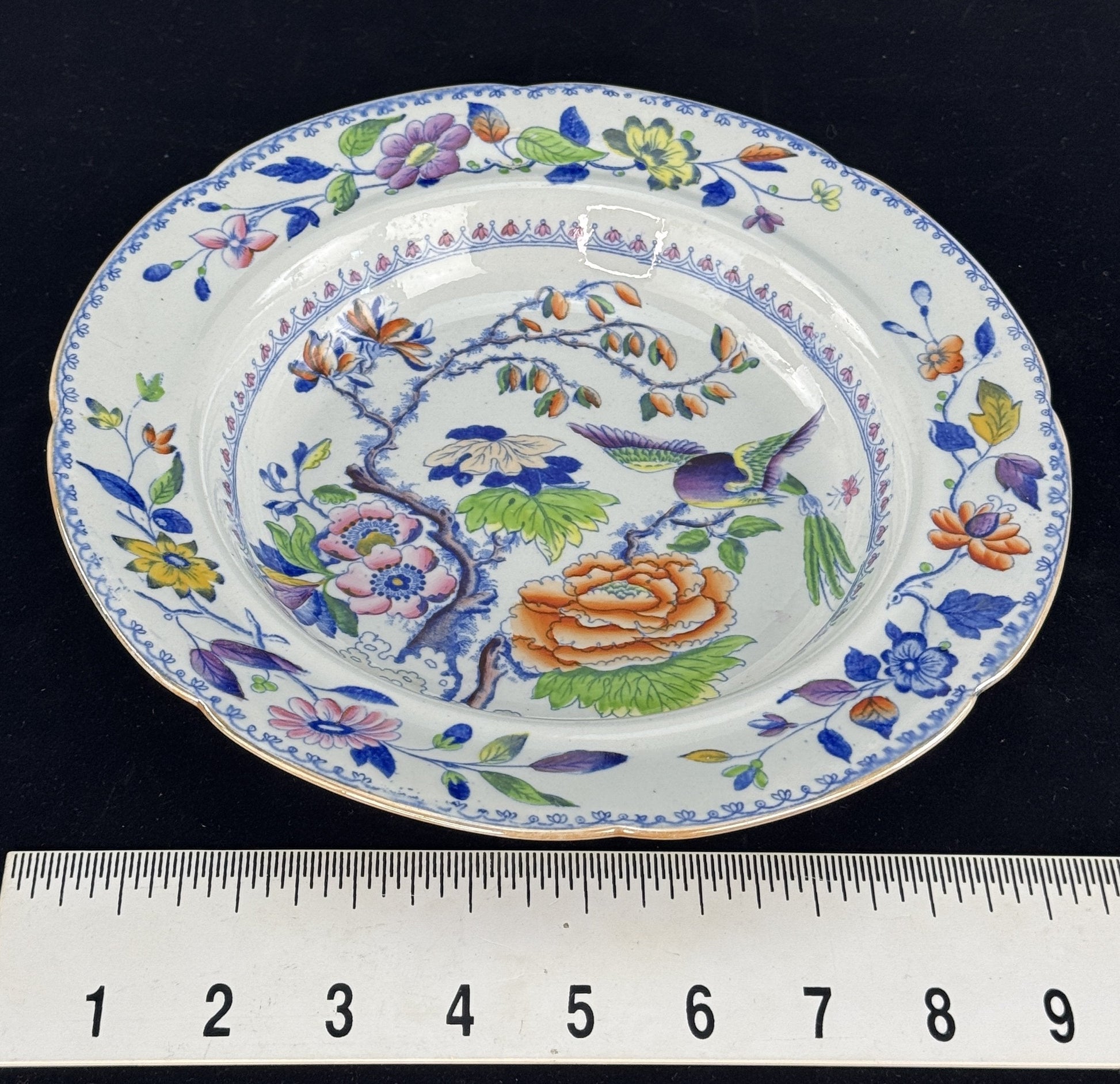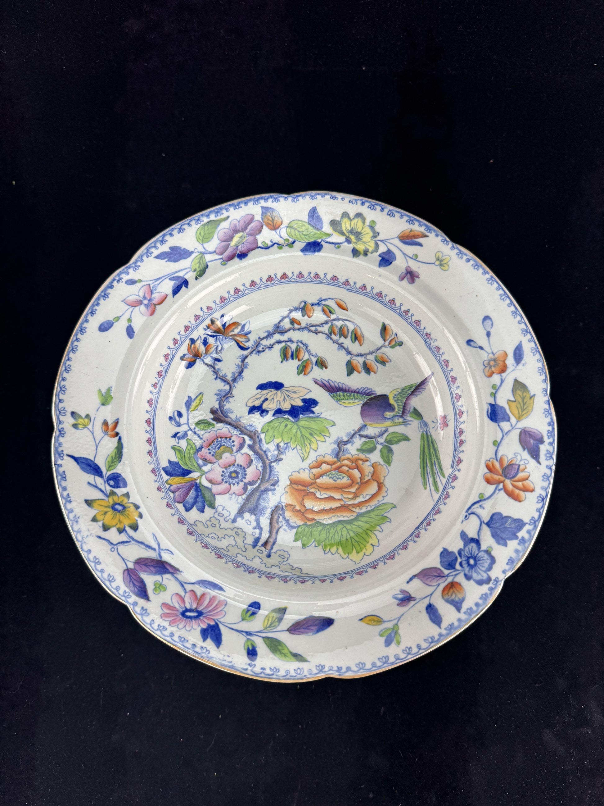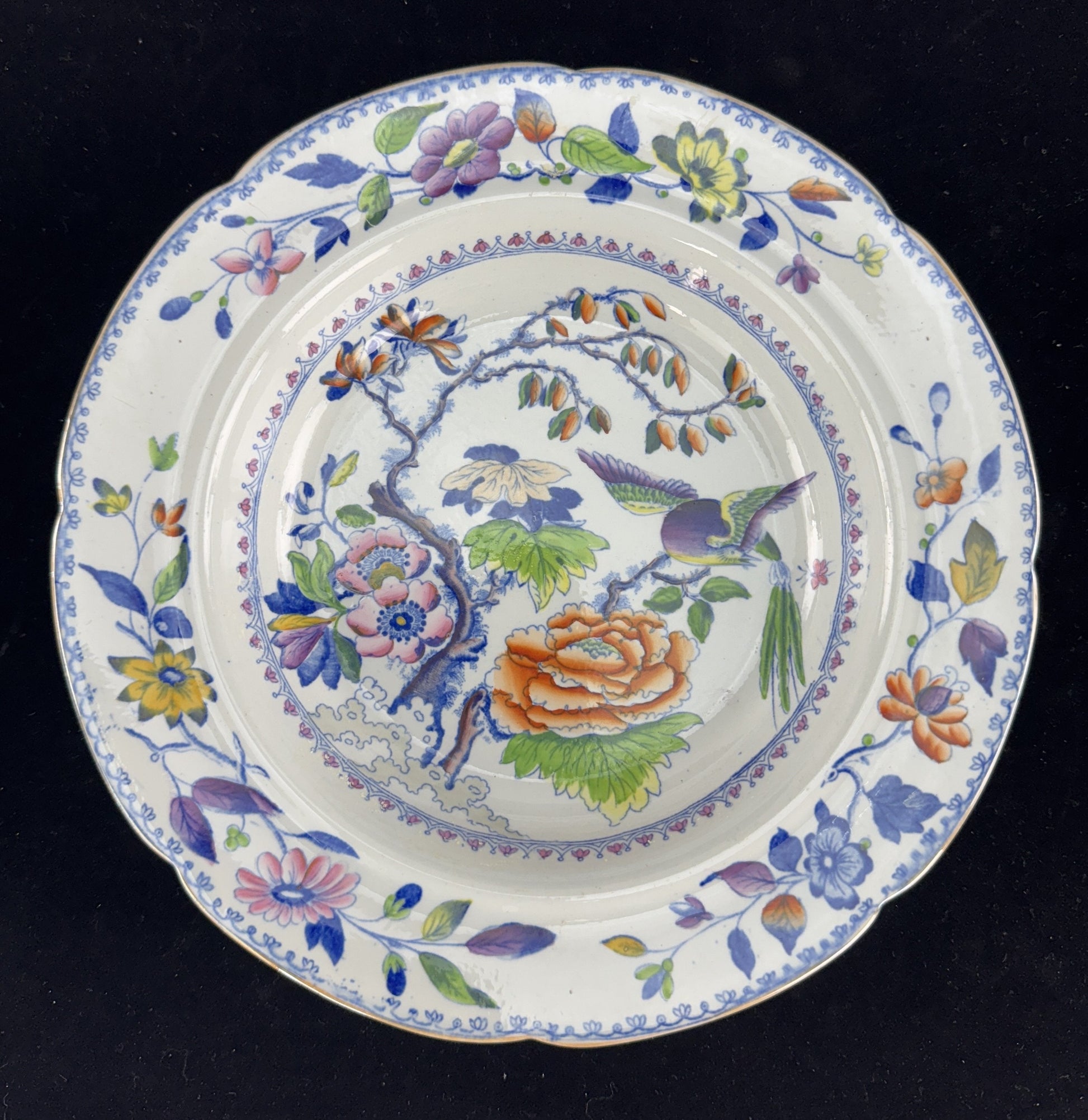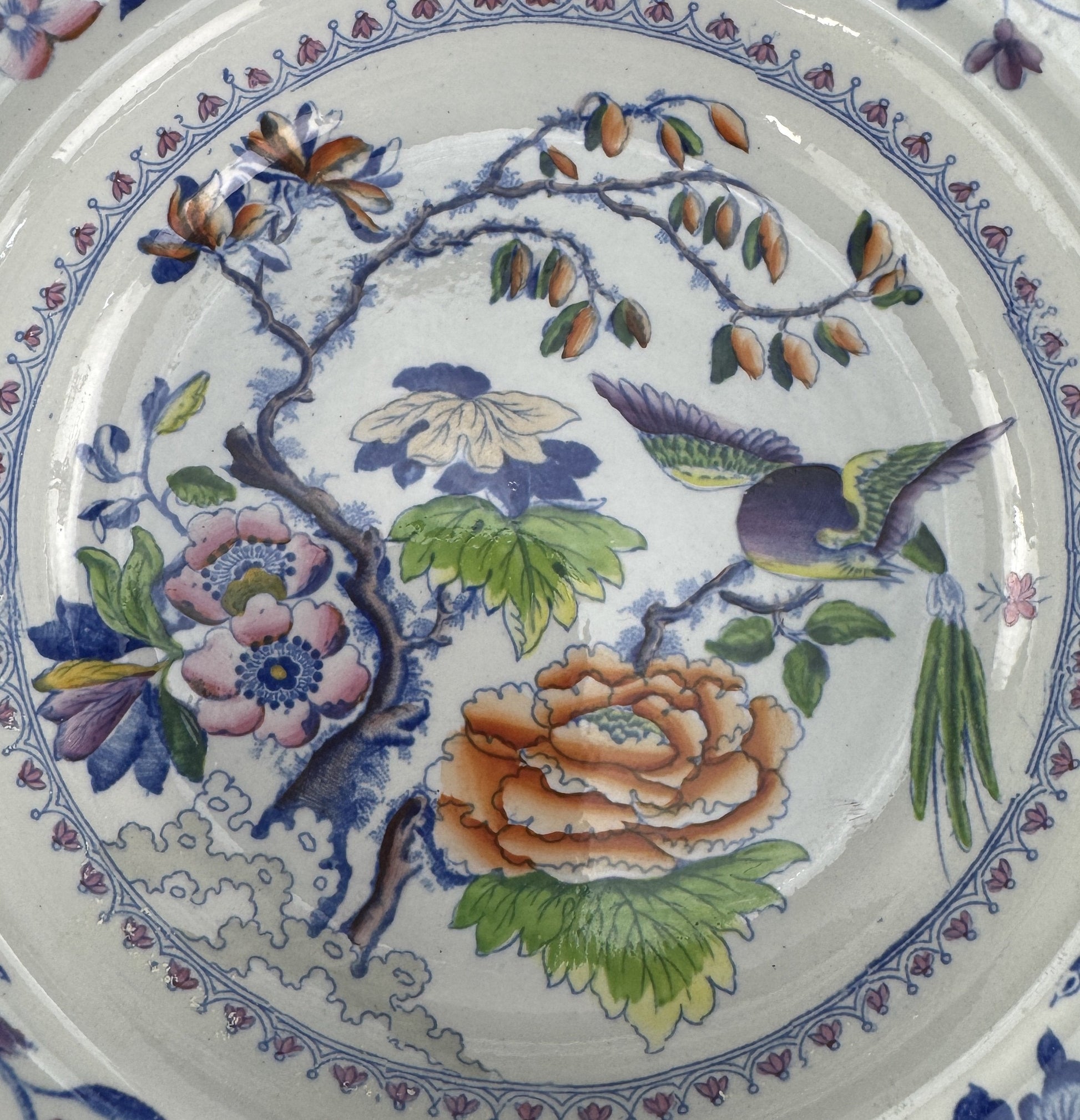 Presented is a fantastic set of 12 antique Davenport stone china wide rim soup bowls or soup plates, dating to circa 1810-1815. These bowls are made in the highly sought after Flying Bird pattern, which is a vibrant and colorful Chinoiserie pattern depicting a long tailed bird in flight surrounded by stunning flowers and foliage. The palette is a very eye-catching array of blues, greens, orange, purple and pink shades, with fine gold gilt detailing. This pattern would later be produced by Mason's Ironstone as well as other fine English makers. We have many additional pieces in this pattern from the same estate including some particularly rare examples, which you can find by searching “Flying Bird” in our store.