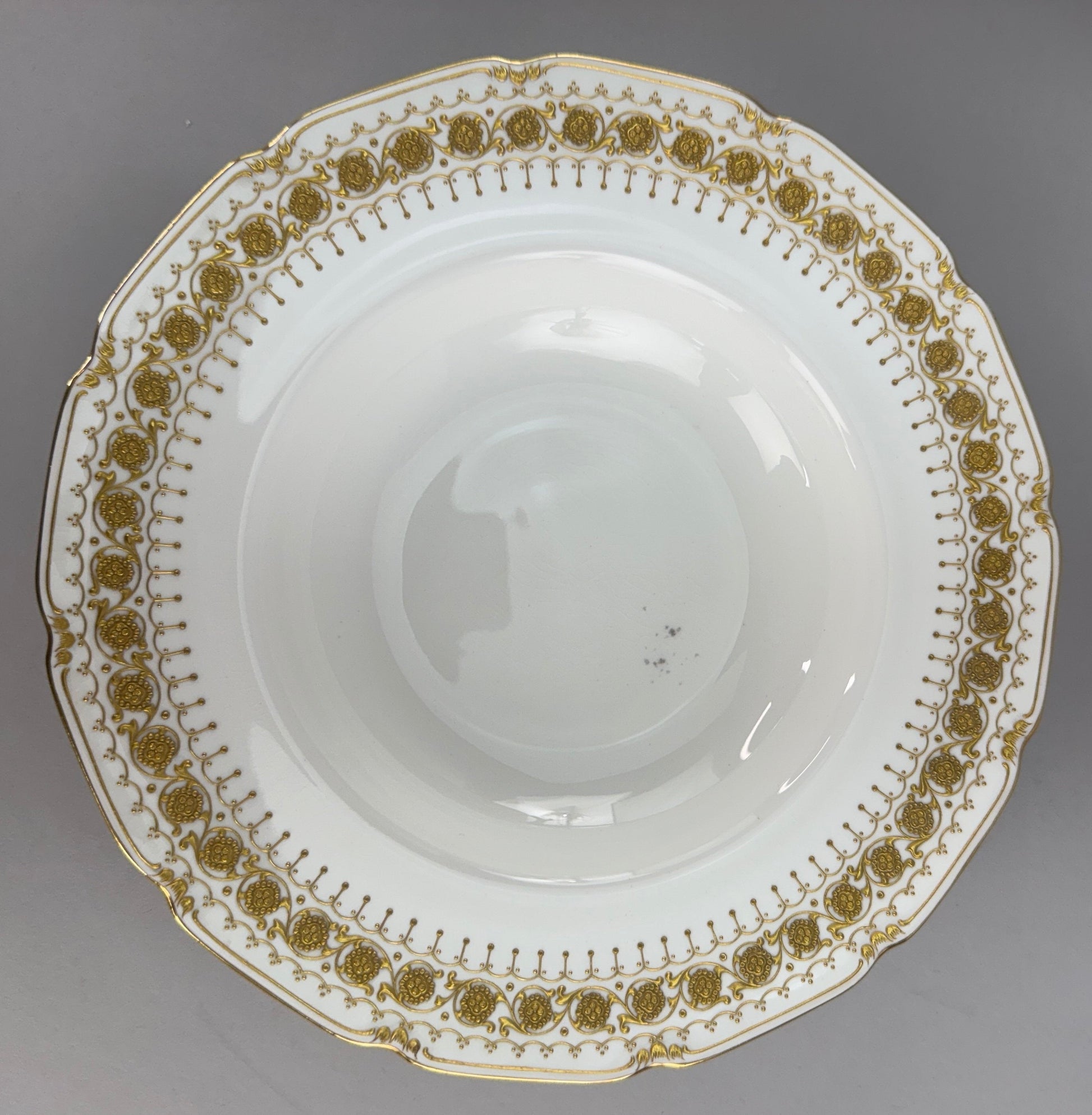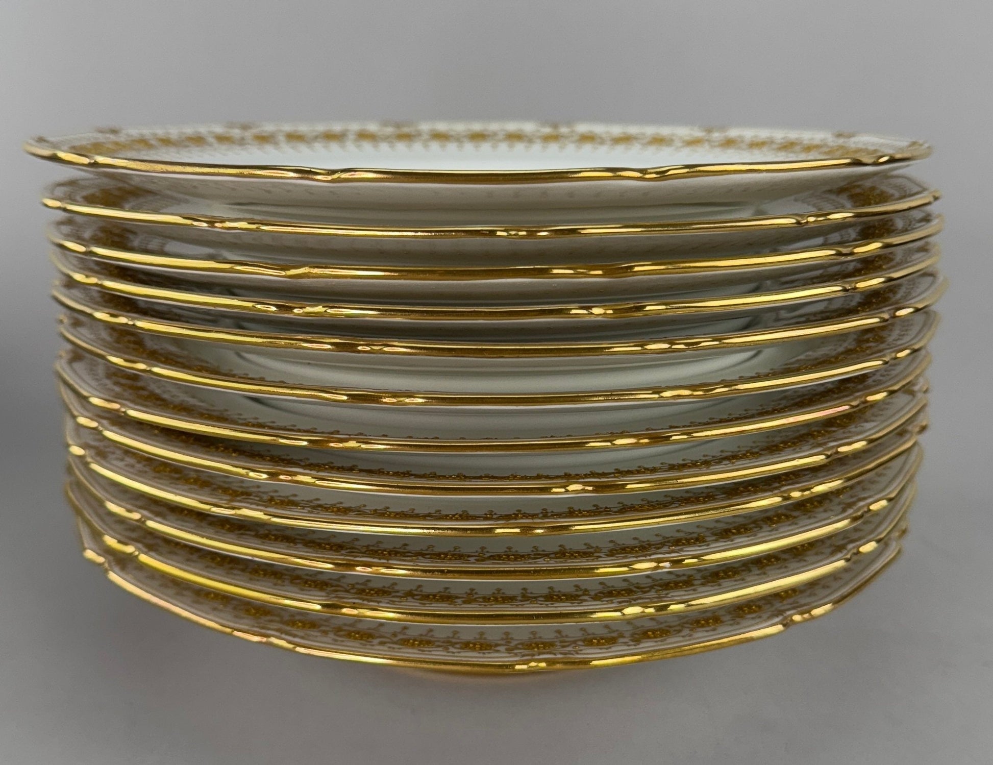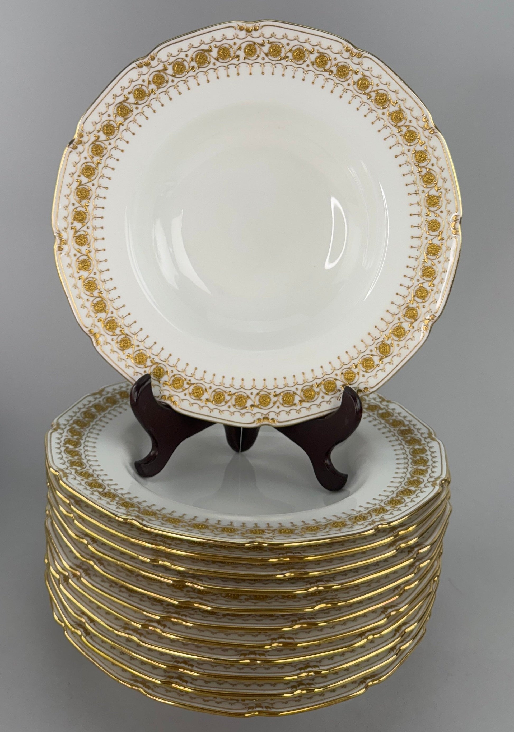 Set 12 c1920s Royal Doulton Noke's Tiffany Co Raised Gilt Rim 9.5" Soup Bowls