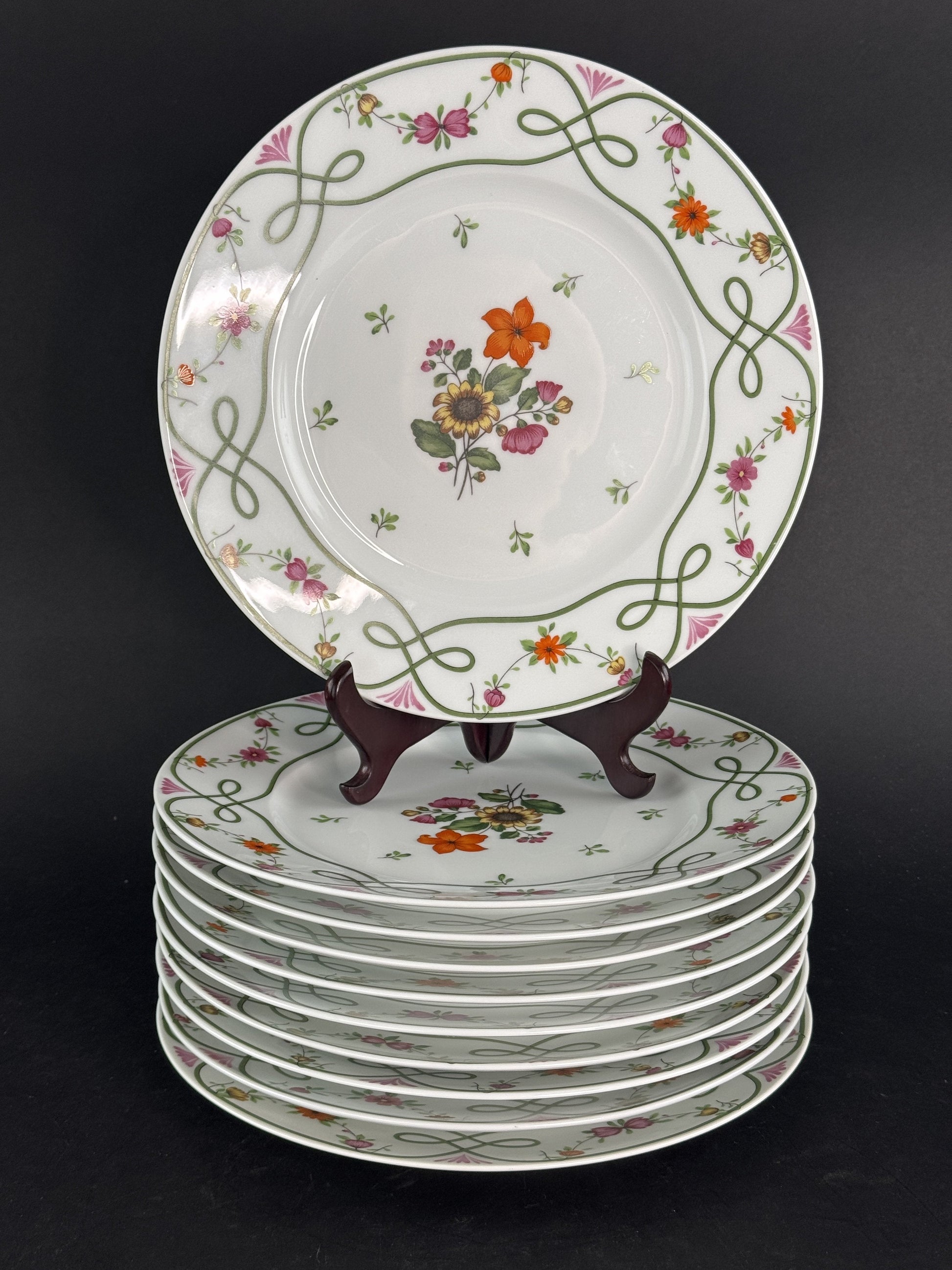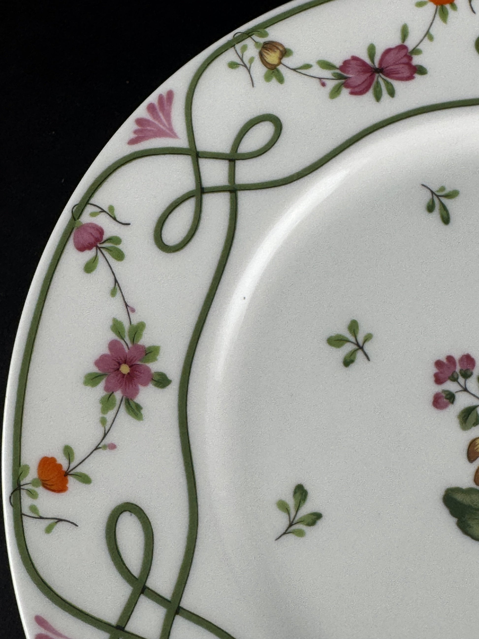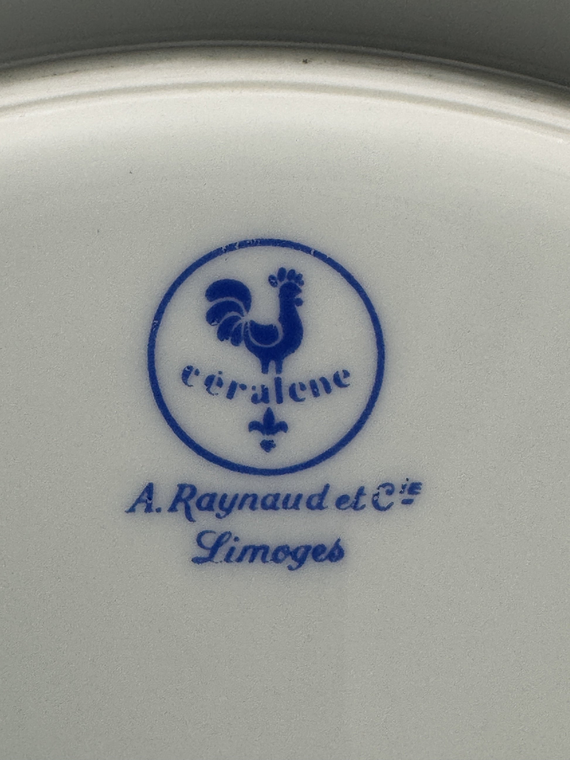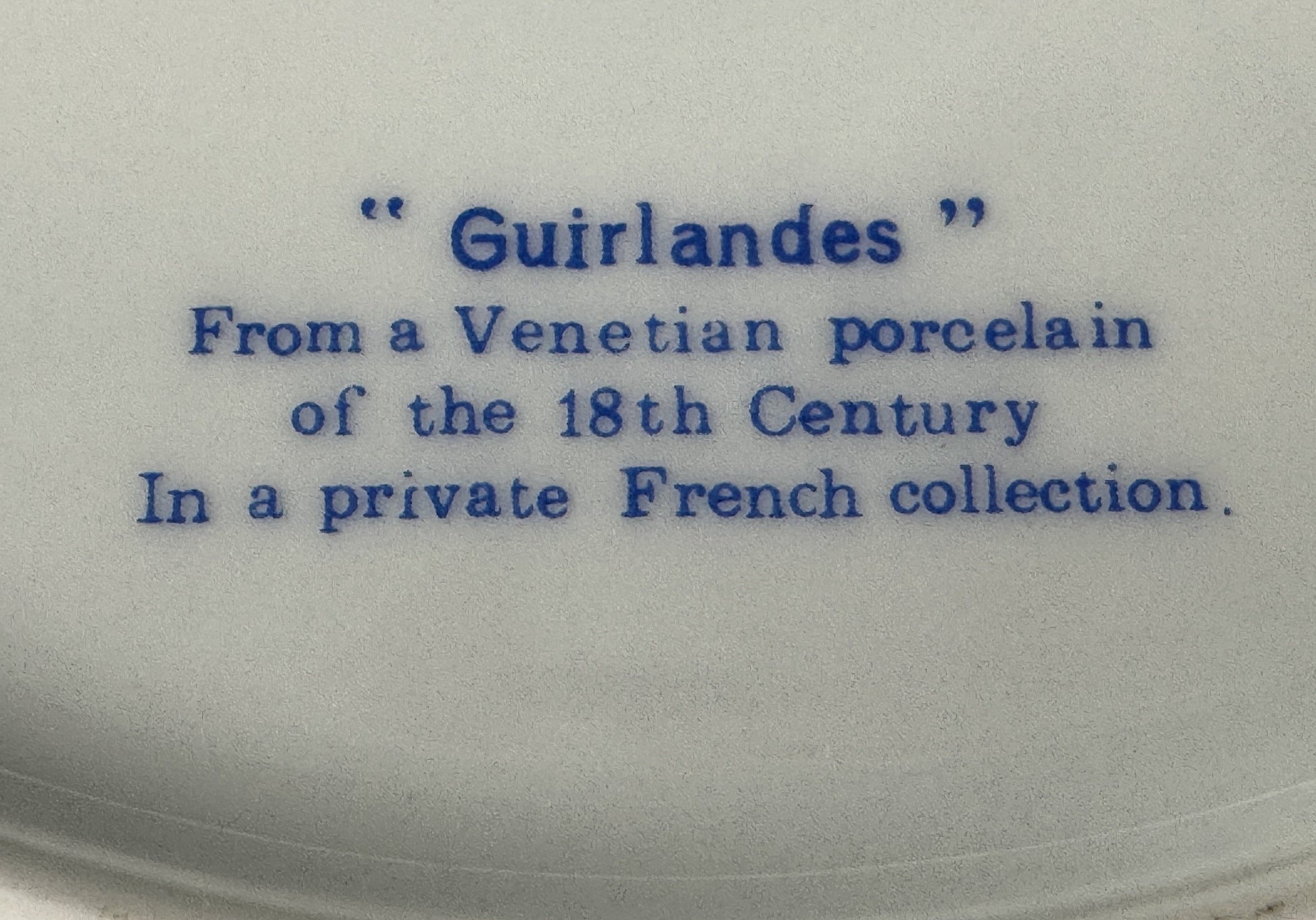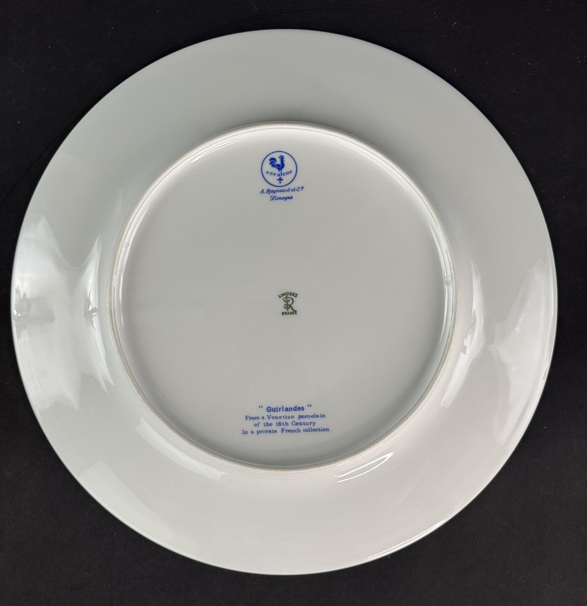 The plates are signed on the back for A. Raynaud et Cie, Limoges (Ceralene) as well as the name of the pattern, Guirlandes—From a Venetian porcelain of the 18th Century in a private French collection.
