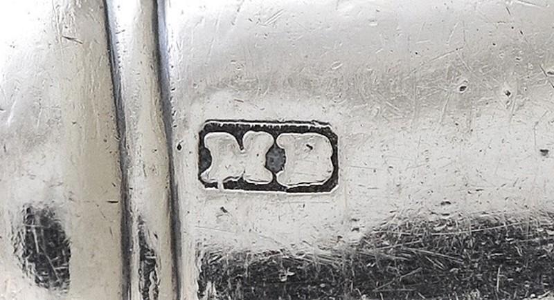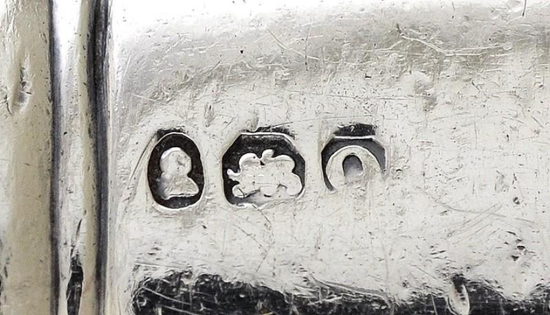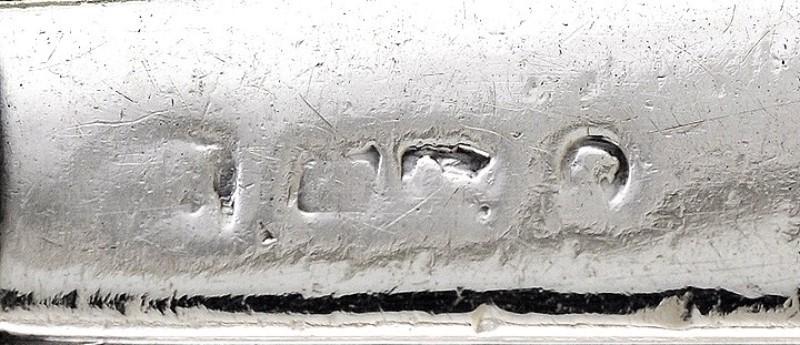 All six knives have English hallmarks, but the marks vary in how clear they are as well as what they are. Three have a very clear maker's mark of MB, likely Matthew Bolton, with the lion passant for sterling silver, the duty stamp of King George III's head, and the date letter O for 1809 (2) or M for 1807. Two of the other three have Victorian marks: Queen Victoria's duty stamp, the lion passant, the crown for the city of Sheffield, and at least one other rubbed mark. The last has mostly rubbed marks, likely the Victorian marks again. Regardless, all the knives match in design and crest, so presumably the Victorian knives were made to match later.
