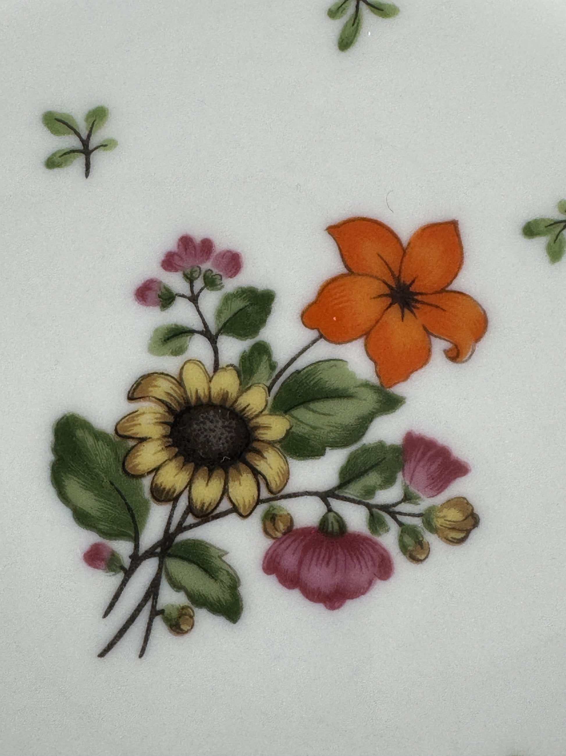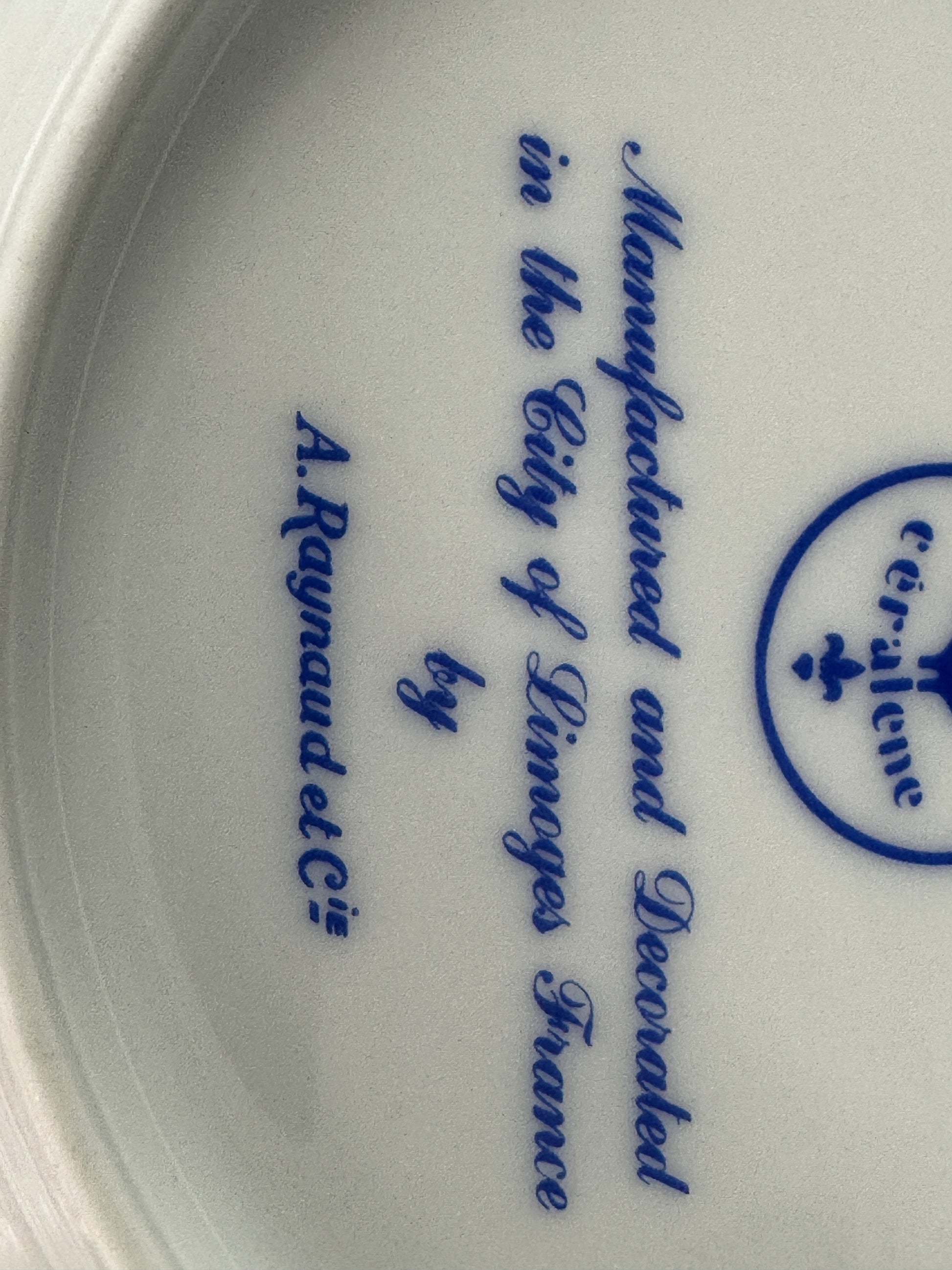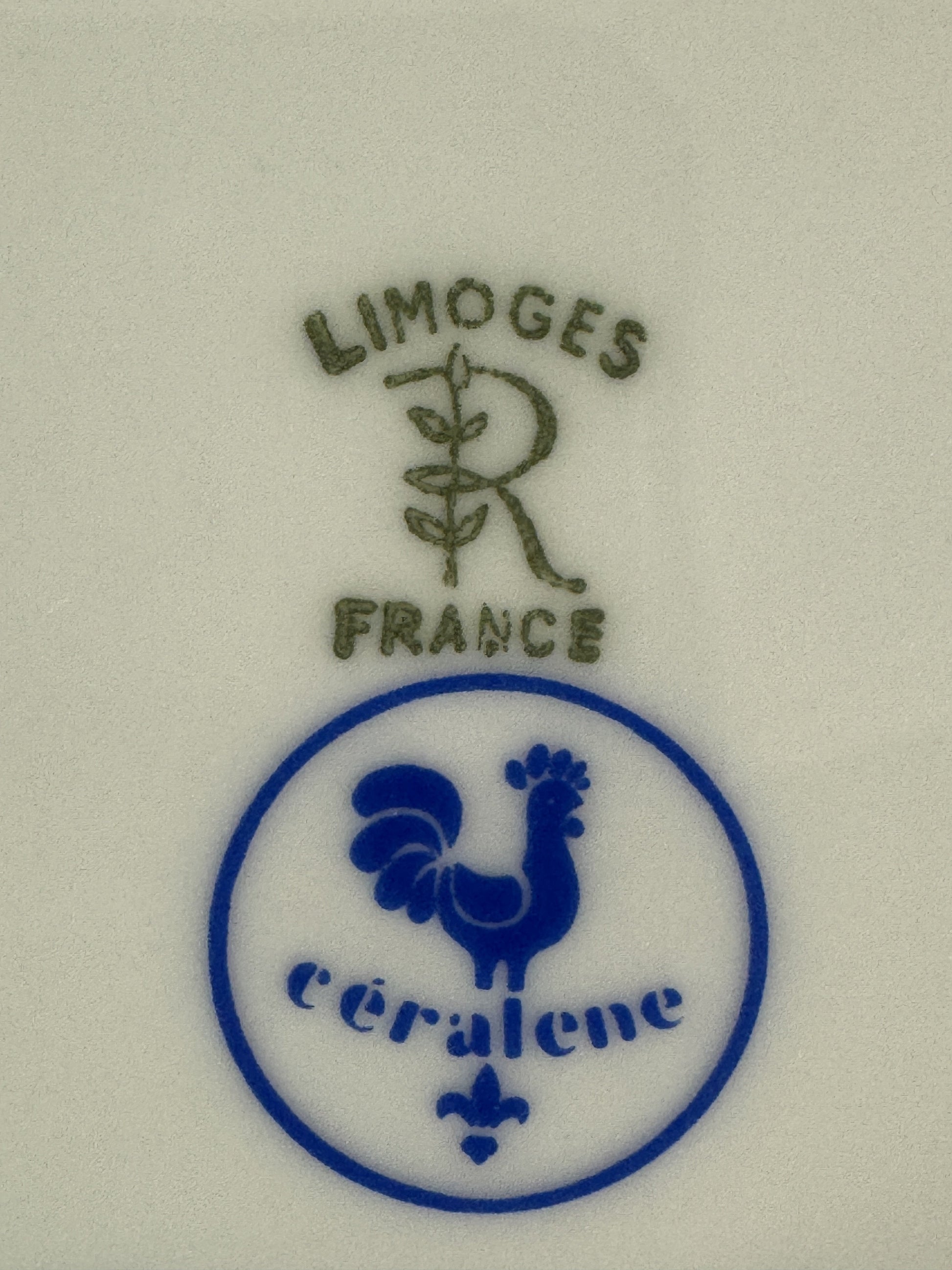 The plates are signed on the back for A. Raynaud et Cie, Limoges (Ceralene) as well as the name of the pattern, Guirlandes—From a Venetian porcelain of the 18th Century in a private French collection.