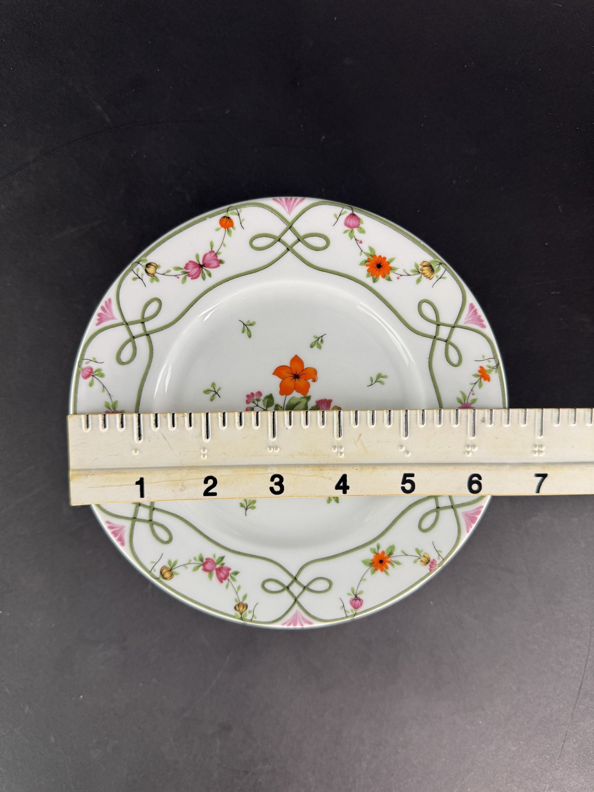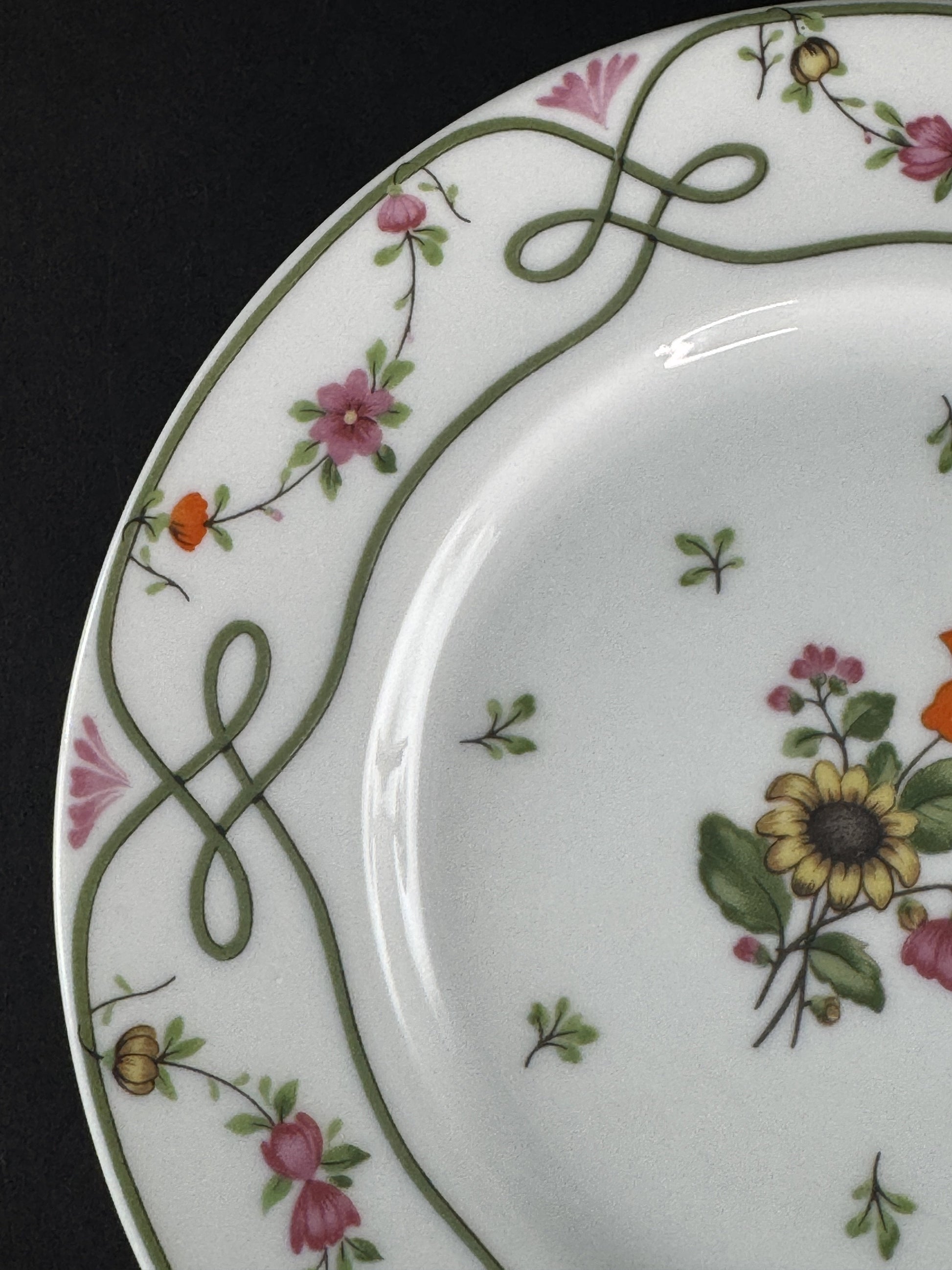 Presented is a wonderful set of six French Limoges porcelain bread and butter plates, by Raynaud et Cie/Ceralene. These plates are made in the Guirlandes pattern, emulating a Venetian porcelain design from the 18th century. The porcelain is white with floral garlands and green trim around the rim and a prominent spray of flowers and little herbaceous leaves in the center. Please note that we have additional listings of dinner plates in this pattern, which you can find by searching Guirlandes in our store or reaching out to us.
