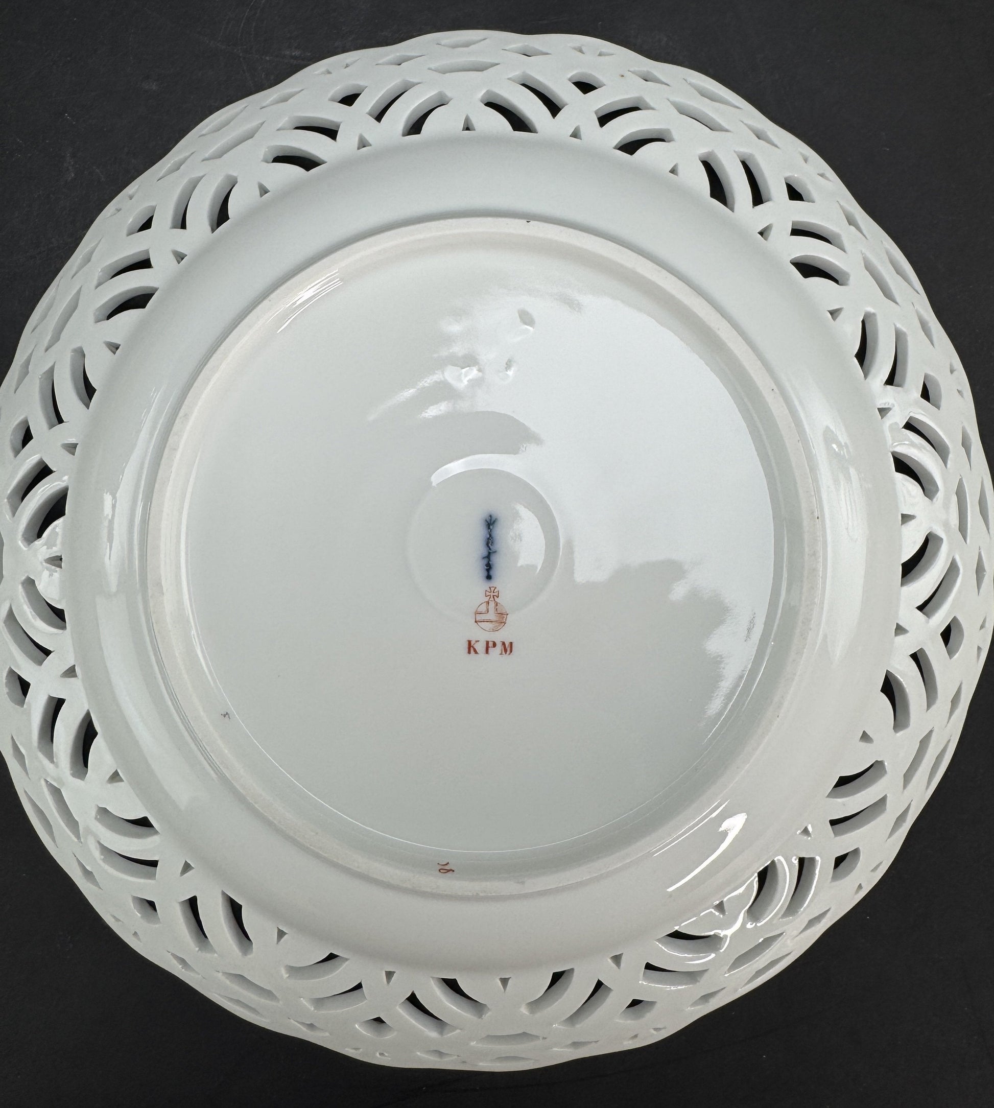 Presented is an exceptional quality set of 9 antique KPM porcelain plates, dating to around the 1890s. The plates are beautifully made with a reticulated rim, made up of intricate openwork with fine gold gilt detailing and little bowtied ribbon designs. The solid centers are skillfully hand painted with colorful and realistic flowers, all individually done, no two identical, surrounding by little butterflies and accent flowers. The colors are mostly pinks, purples, and red-orange shades, with fresh green for the flowers' leaves, so this is a very lively set. The interior edge has a basket weave texture to it, which is a nice touch.