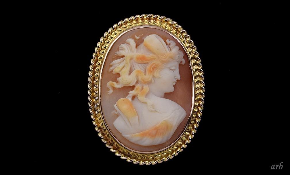 10k gold and carved shell cameo pin of a young woman.