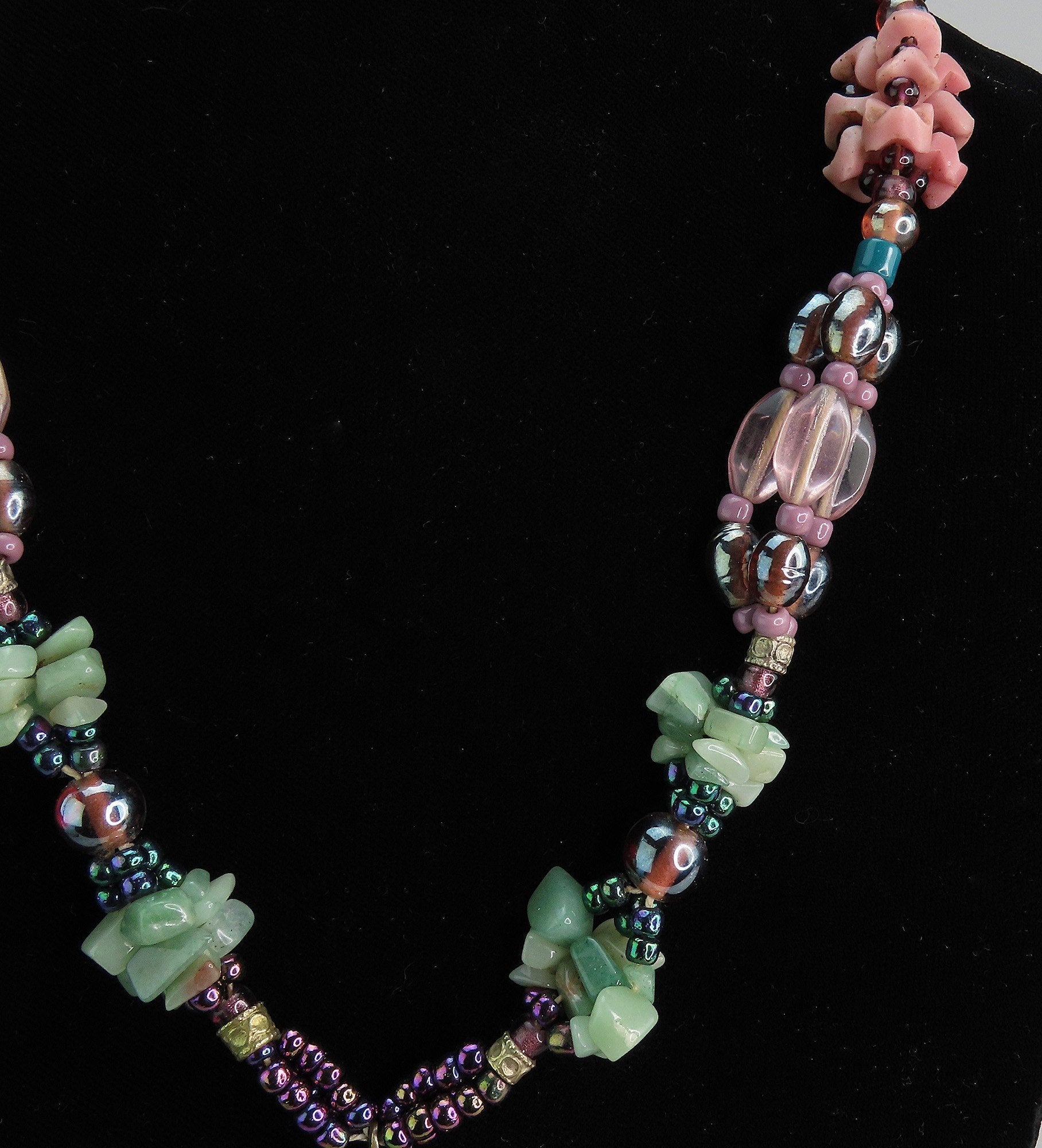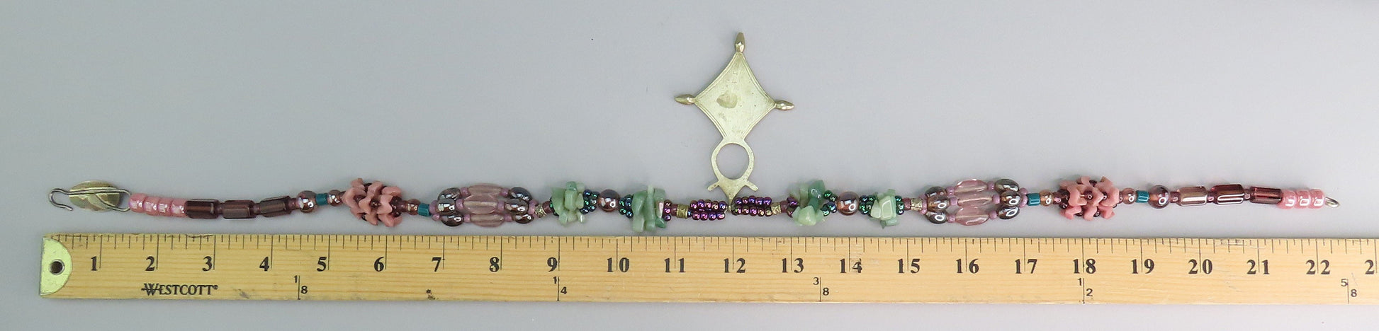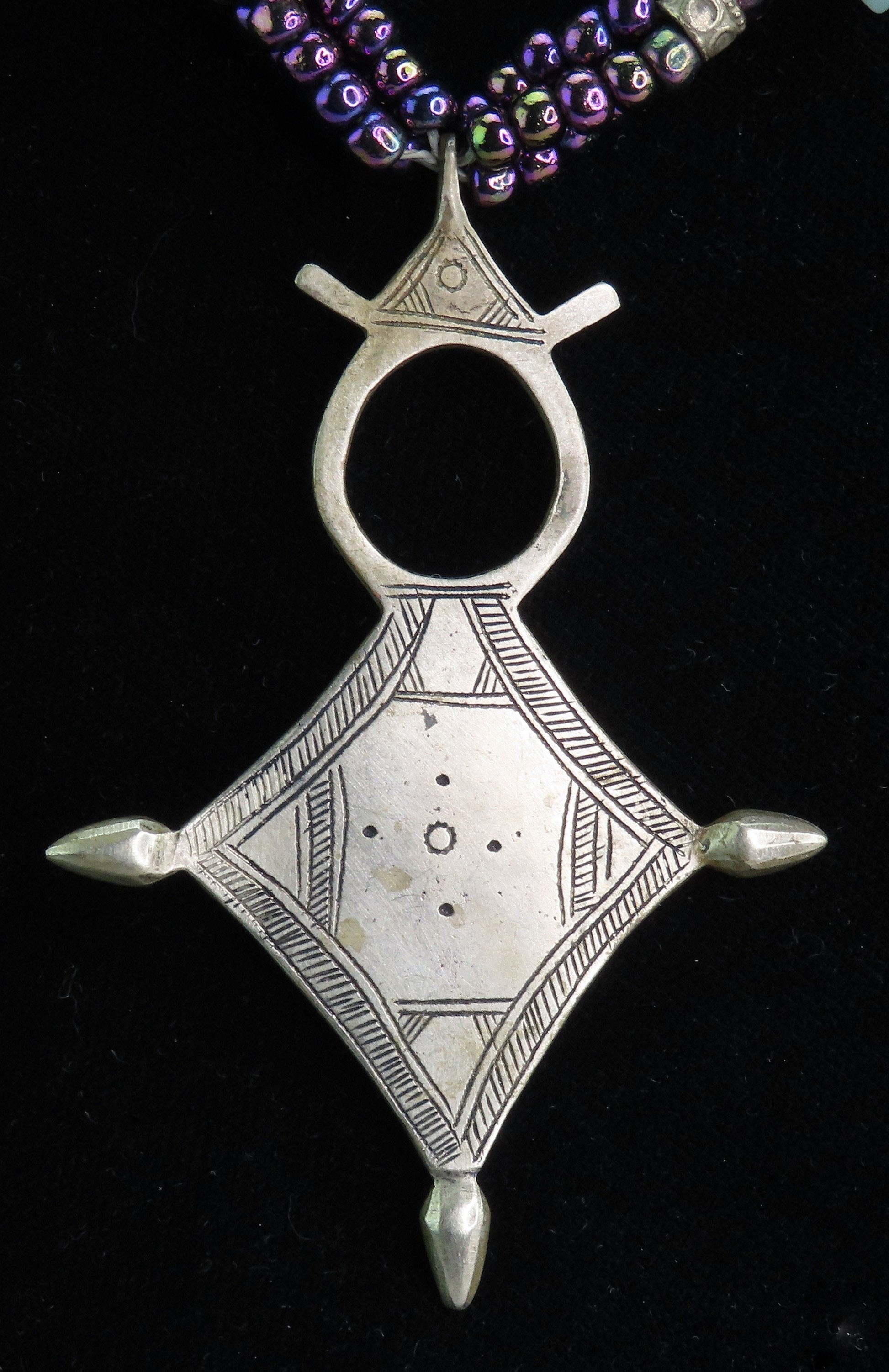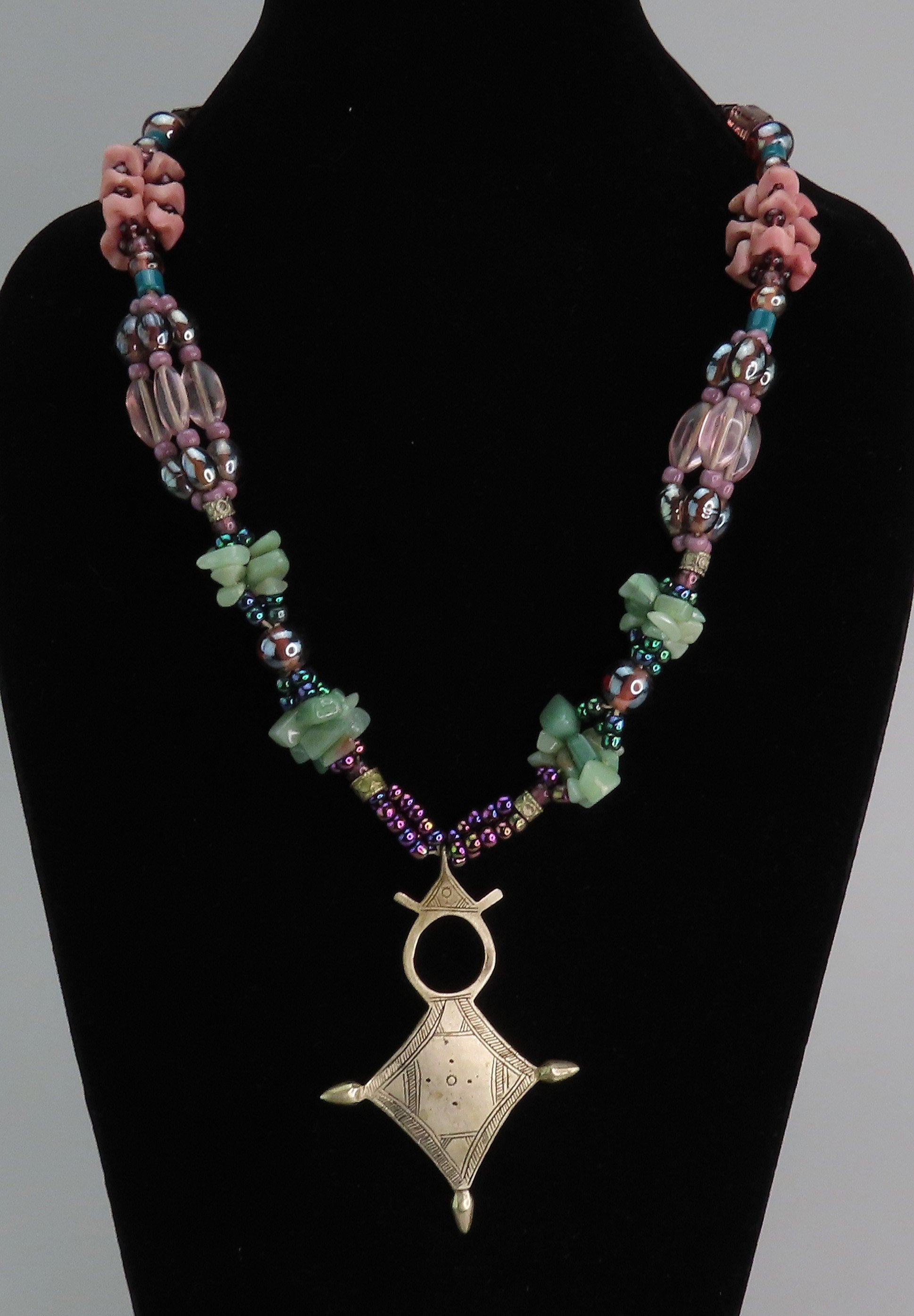 Presented is a unique artisan beaded necklace, with a tuareg cross pendant. The necklace itself is done in shades of light green, pink and purple, with glass beads, green aventurine tumbled gemstone beads, and dyed coral, artfully arranged in sections along the necklace. The pendant is a tuareg/amazigh type agadez cross, hand made and hand engraved. The clasp is a secure hook and eye style, in sterling silver.