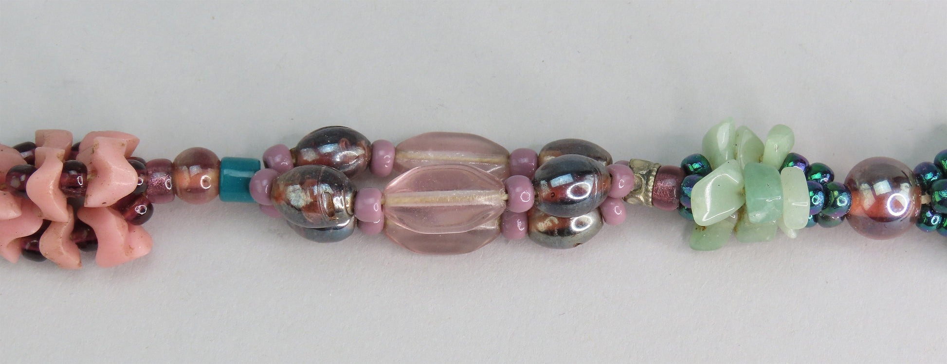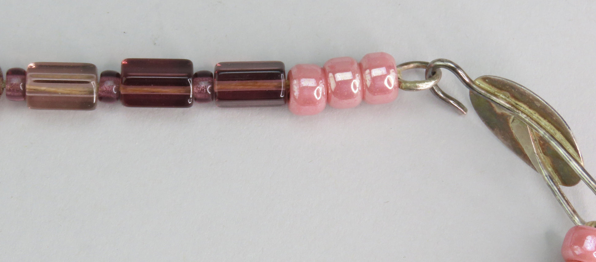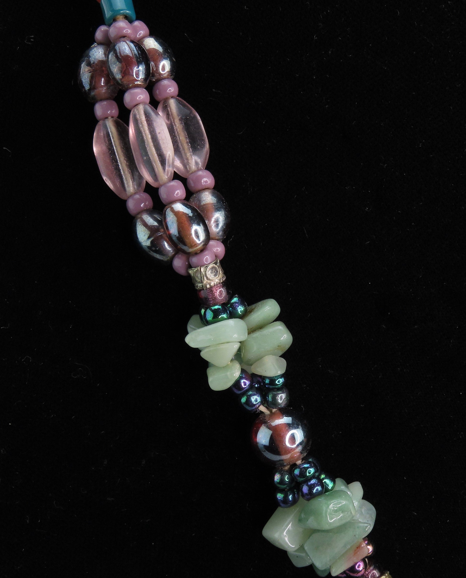 Presented is a unique artisan beaded necklace, with a tuareg cross pendant. The necklace itself is done in shades of light green, pink and purple, with glass beads, green aventurine tumbled gemstone beads, and dyed coral, artfully arranged in sections along the necklace. The pendant is a tuareg/amazigh type agadez cross, hand made and hand engraved. The clasp is a secure hook and eye style, in sterling silver.