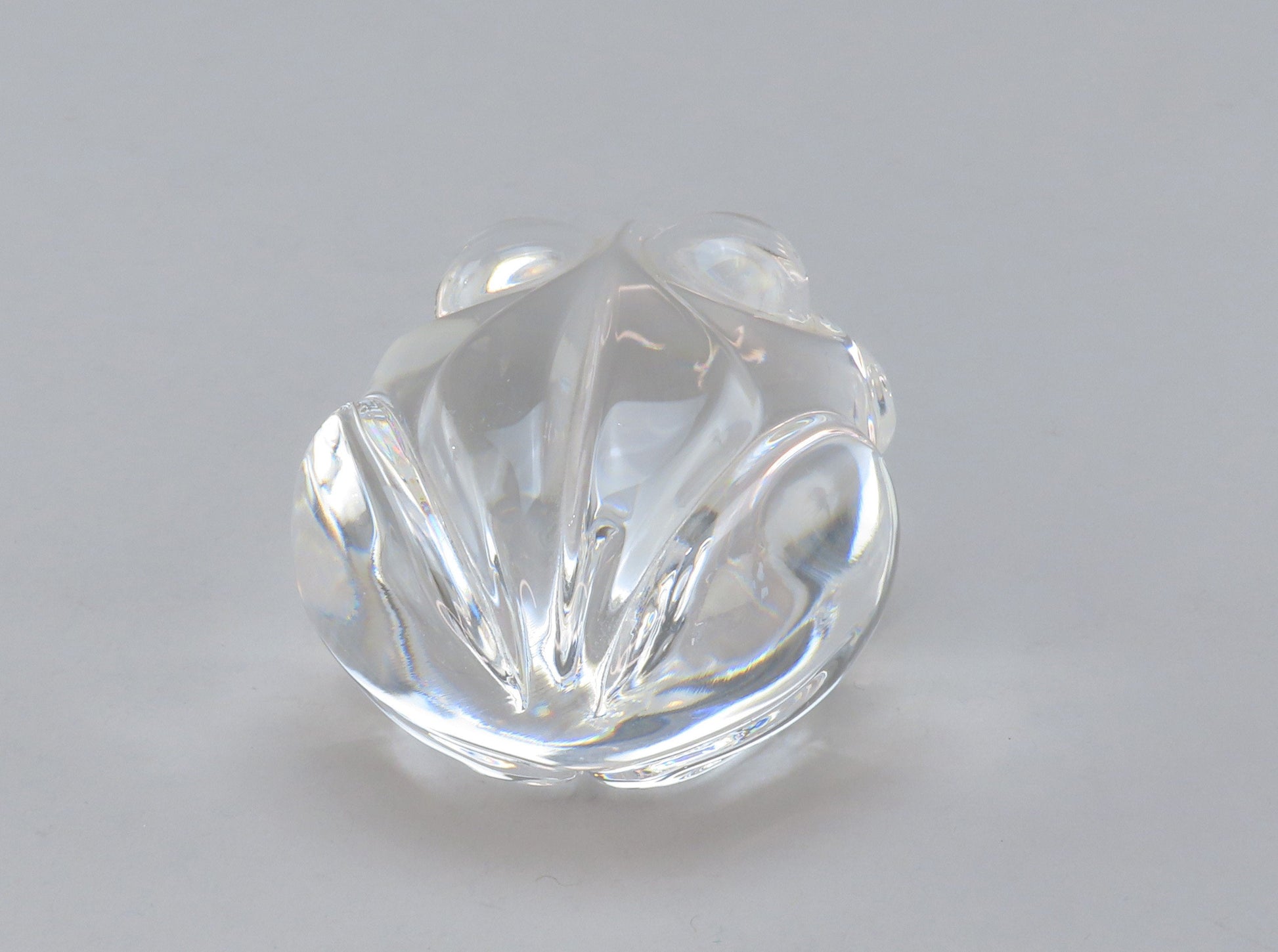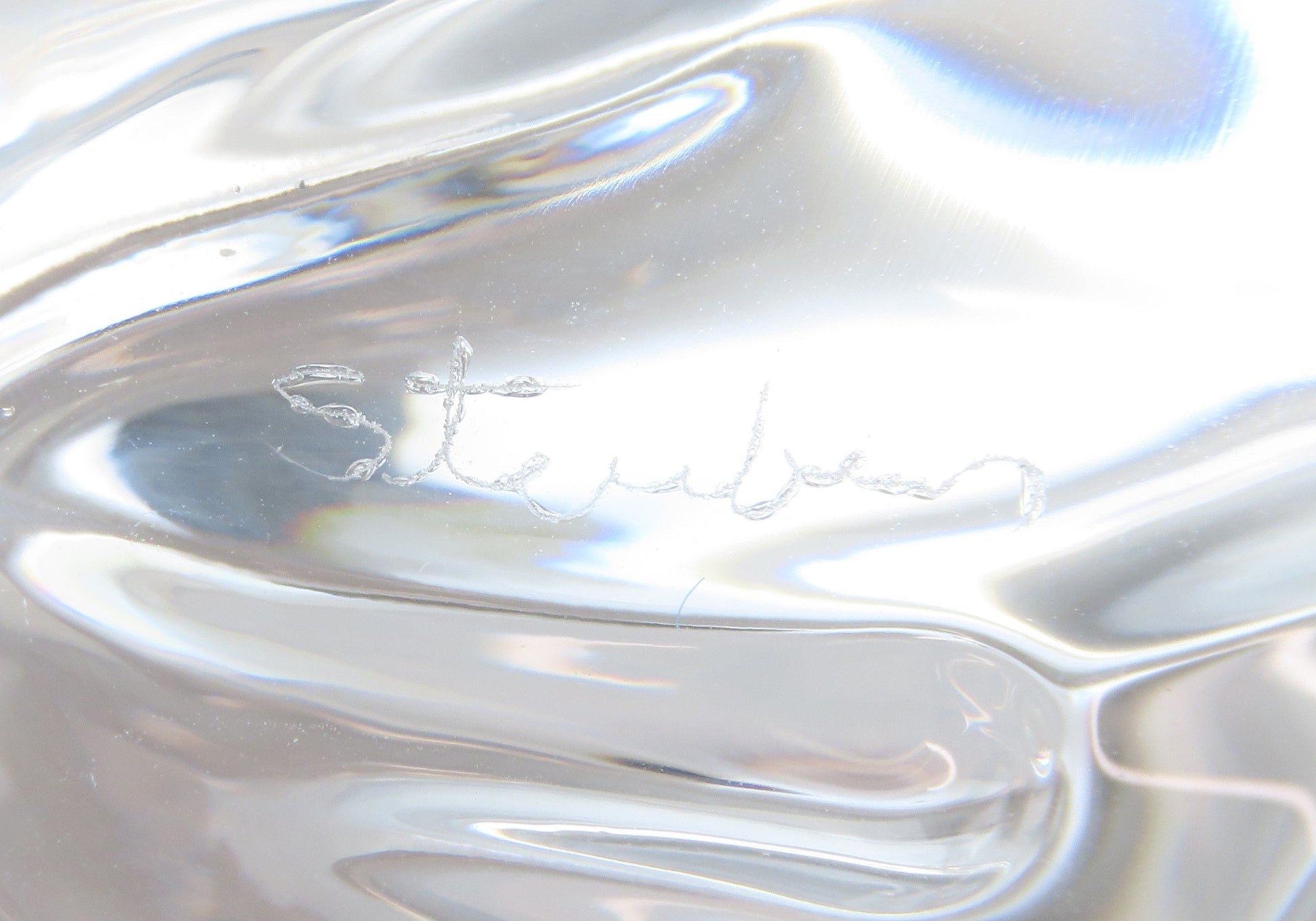 Presented is a nice vintage Steuben art glass paperweight or hand cooler, in the shape of a frog. This Steuben design is numbered 5510 and is the work of Lloyd Atkins, one of Steuben's most prolific and well known artists. The design was retired in 1996.