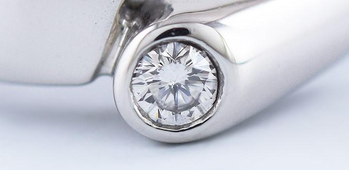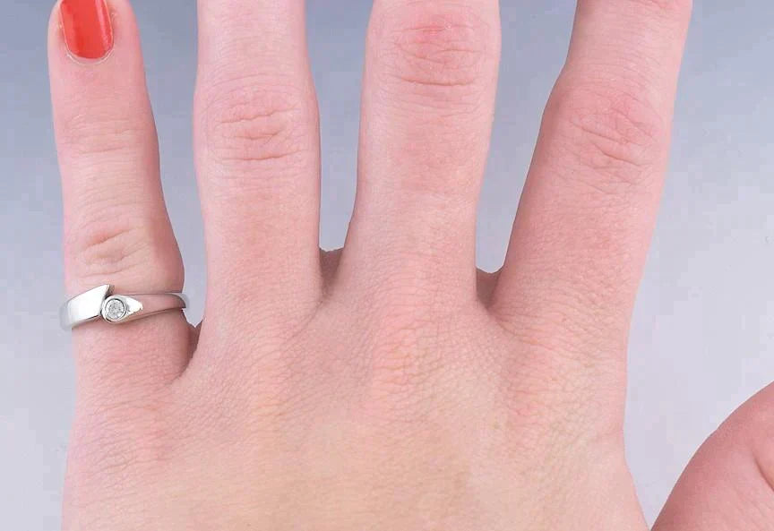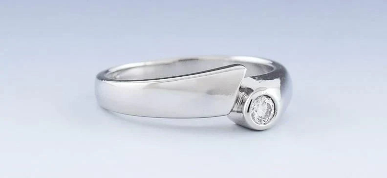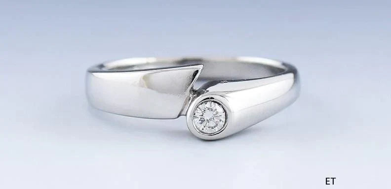 offset design, bezel set with a sparkling modern brilliant cut diamond. This