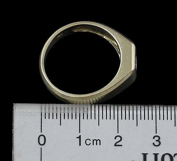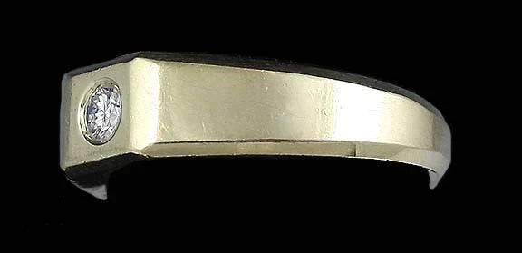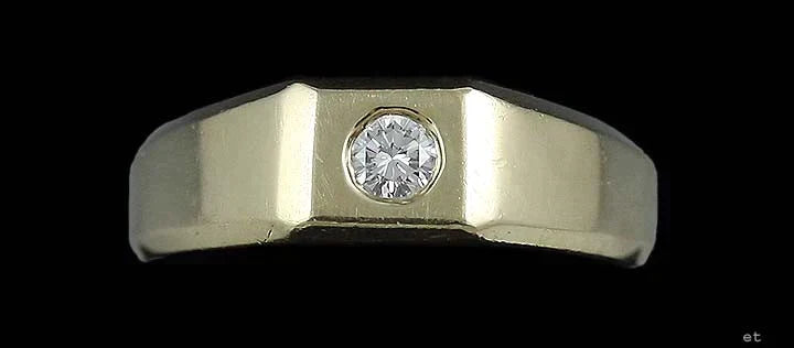 Presented is a heavy weight 14K gold and diamond ring. This piece is probably a man’s ring, although it certainly could be worn by either a woman or a man. The ring is topped with a modern round brilliant cut diamond that has a lot of life to it. If not for a couple of tiny pinpoint sized pieces of carbon in the very top of the stone, this stone would be VVS clarity. As it is, it is probably an SI stone, but it faces up like a VVS stone. It is certainly eye clean. The diamond has G-H color. The stone is approximately 20 - 25 points in size or around ¼ carat. The stone is securely mounted in a very solid yellow gold mounting with great weight for its size. The ring is fairly modern.