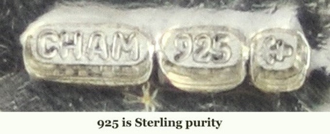 It is marked "925" for sterling silver. It also bears the anchor mark and the letters "CHAM".