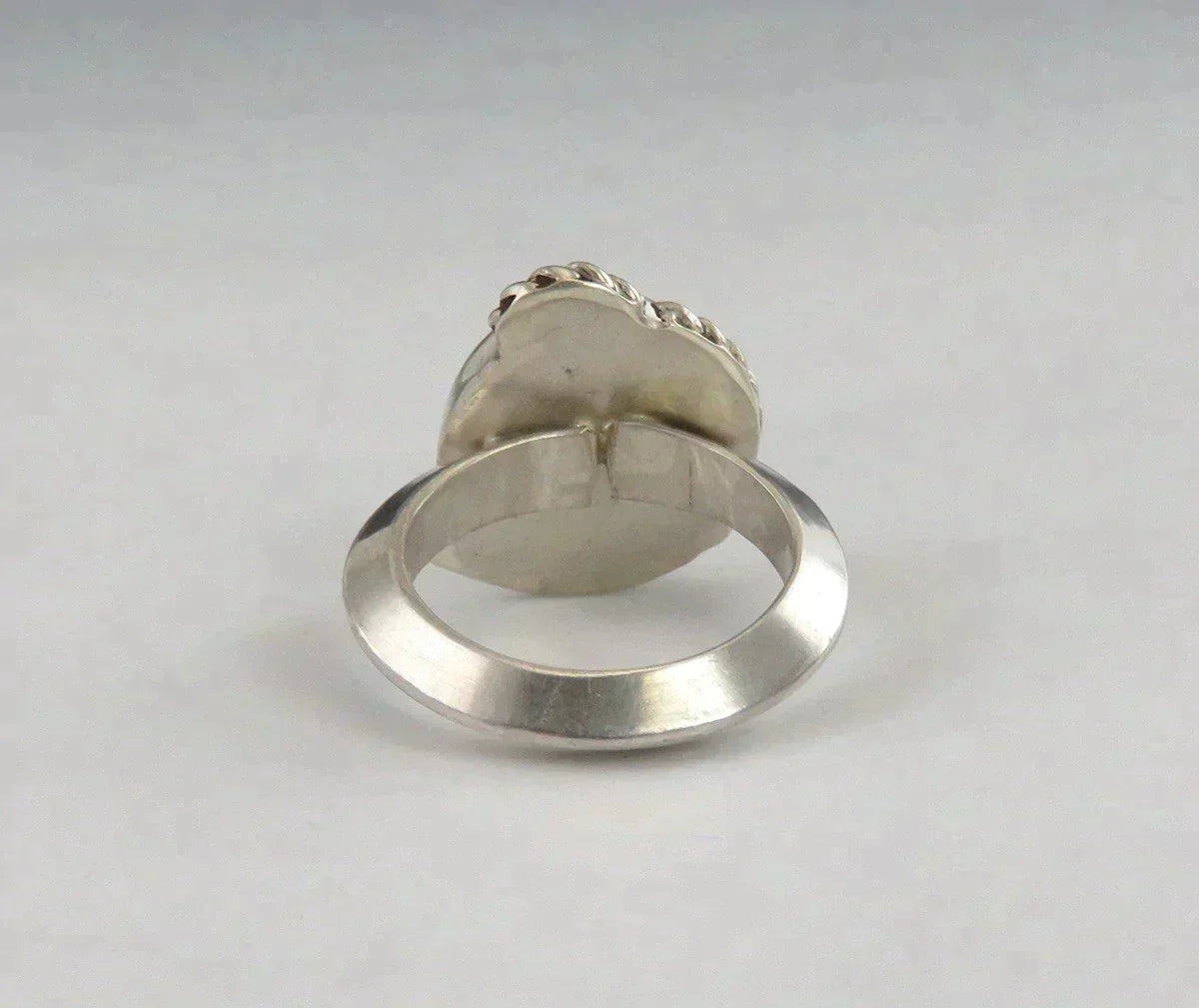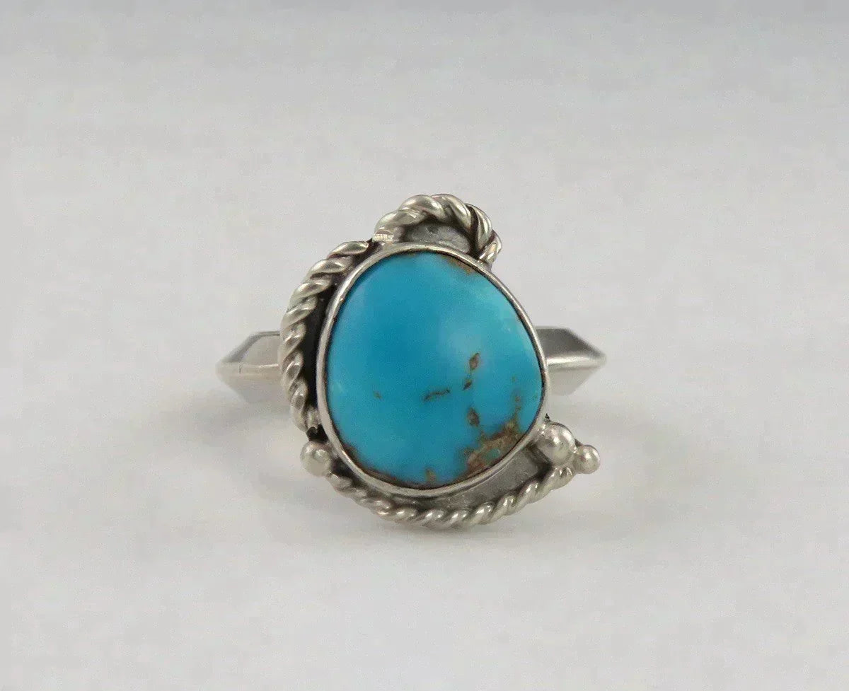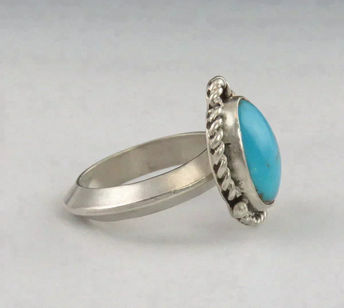 cabochon ring. This is so much more beautiful in person on your finger than the multitude of rings you will see of this age and type. The asymmetrical design and the way the twisted rope of sterling lies naturally around the stone, but not all the way around! This draws your eye to a superb turquoise stone. The color is very deep and rich, and its unique shape and the brown minerals showing on the surface enhance its organic feel. The finger band is fashioned very uniquely as well. The silver is not flattened on the outside of the band, it is two-sided culminating in a pointed shape. This is clearer to understand from our photos. The unique band holds your finger lightly and is wonderfully reflective!