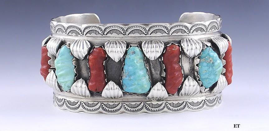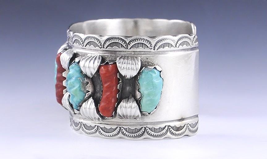 Southwest Navajo Native American Sterling Silver Turquoise & Coral Cuff Bracelet