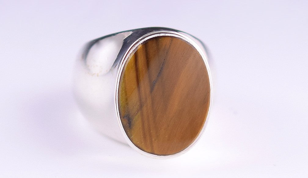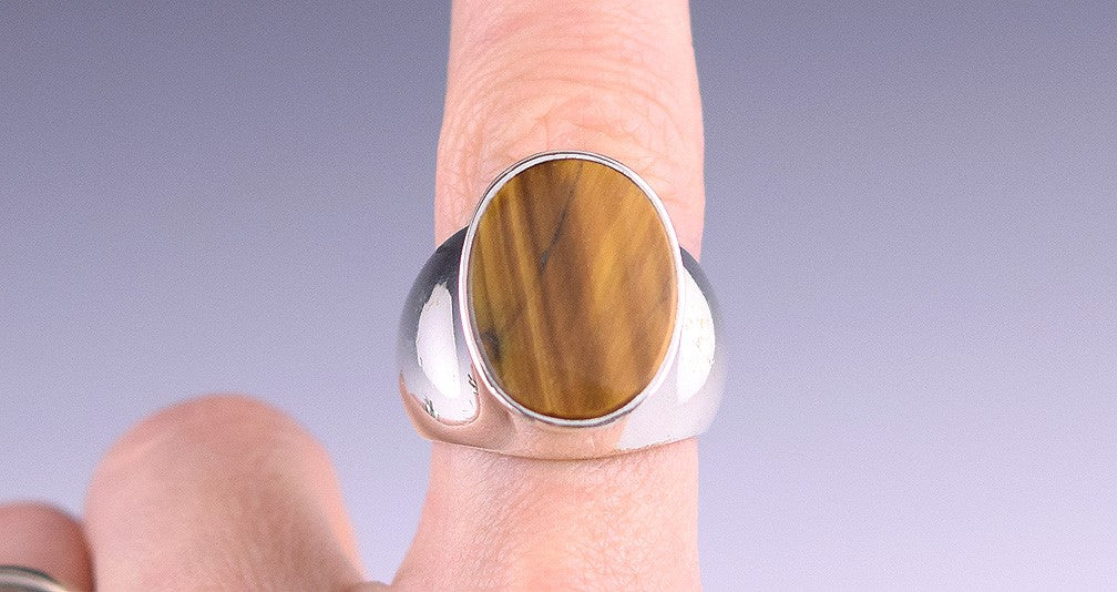 This piece features a wide band set with an oval-shaped tiger's eye stone.