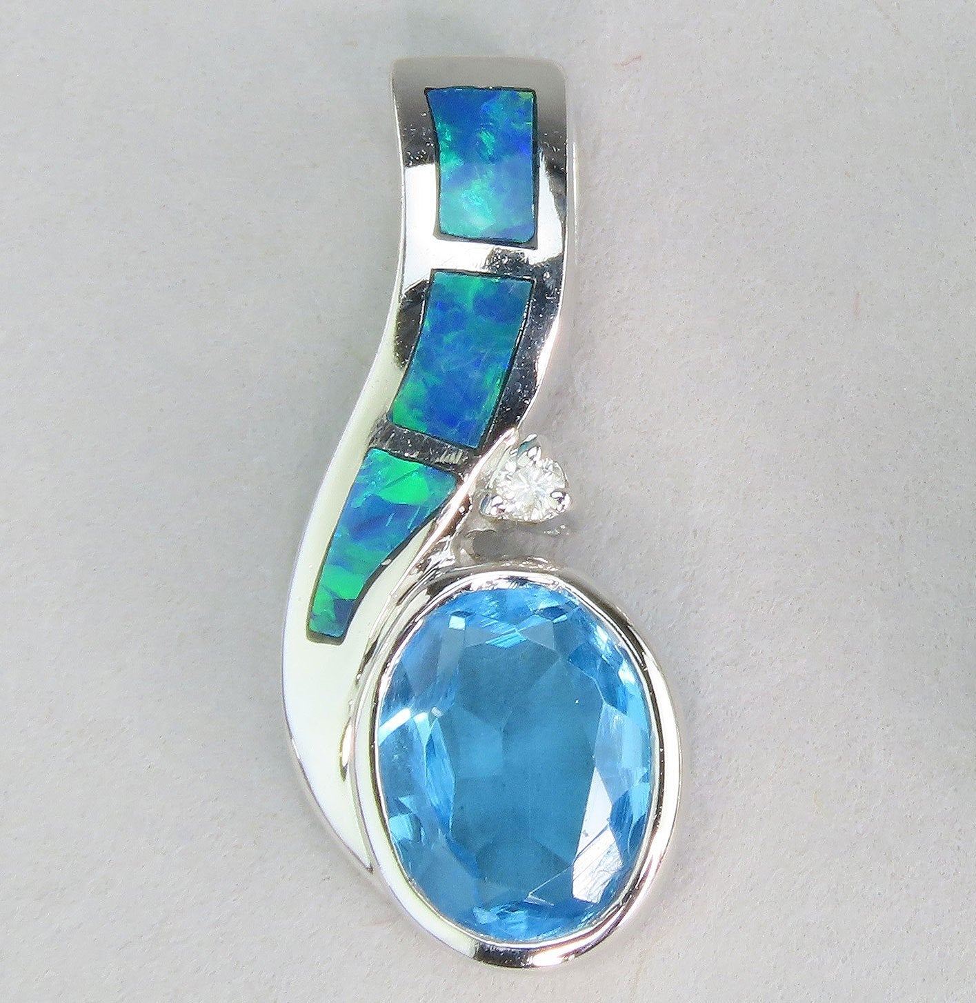 Presented is a wonderful quality, modern 14 karat white gold pendant. This piece is in great condition and the quality of each stone is fabulous. The pendant is bezel set with an oval cut blue topaz measuring about 7.6 x 6 x 3.8 millimeters, or about 1.3 carats in weight. Above the topaz are three inlaid panels of stunning opal, full of flashes of blue, orange, and green fire, with a little round accent diamond to one side. The opals are fabulous quality and all the stones sparkle and catch the light beautifully. The stones are all real, mined from the ground gemstones, verified by our on site gemologist. The pendant has a good size built in bail/loop at the top, with interior measurements of about 4.6 x 3 millimeters, so it will accommodate a good variety of chain styles/sizes.