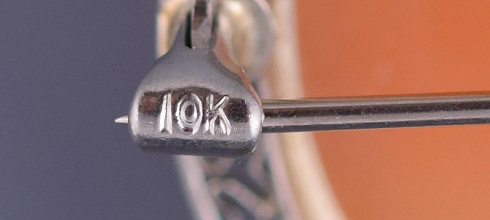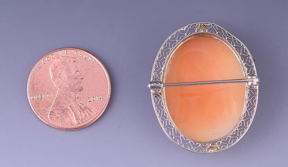 Sparkling Edwardian 10k White Gold Filigree Cameo Pin w/ Carved Woman Flowers
