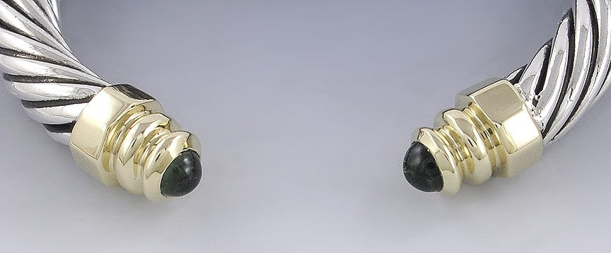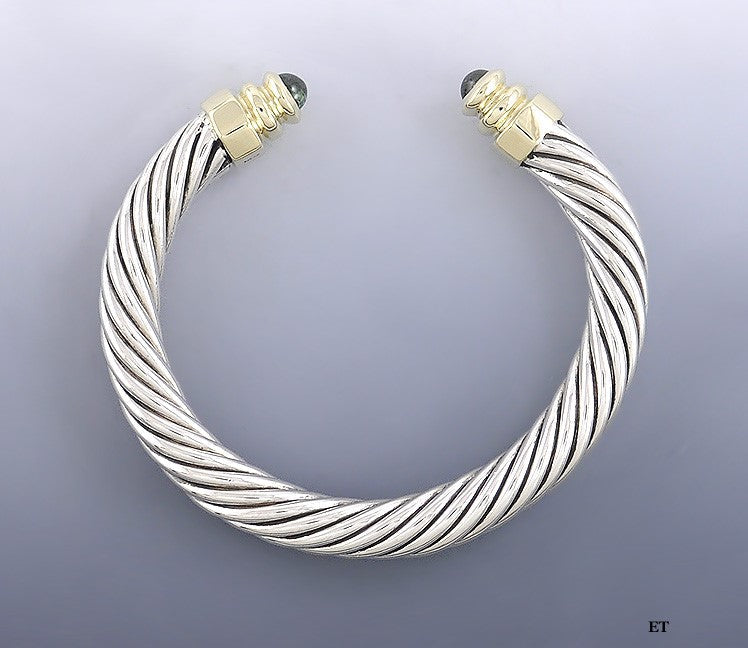 Sterling Silver 14k Gold & Green Tourmaline Cable Twist Torc Bangle Bracelet