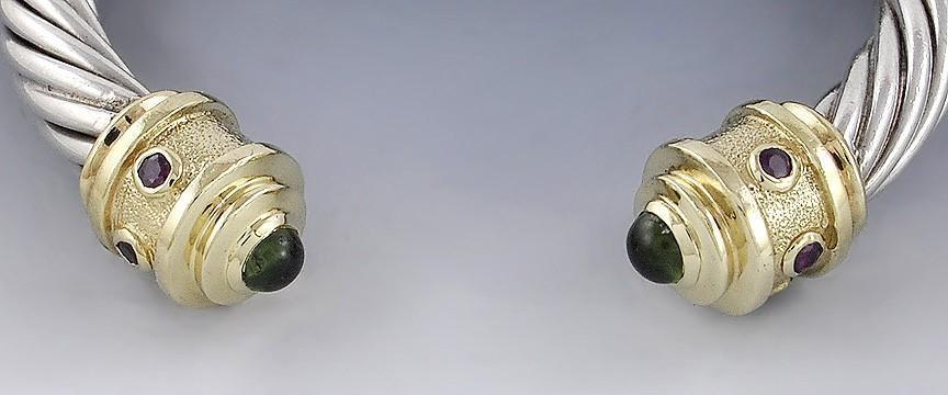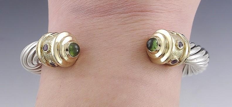 Sterling Silver 14k Gold Green Tourmaline & Ruby Cable Twist Bangle Bracelet