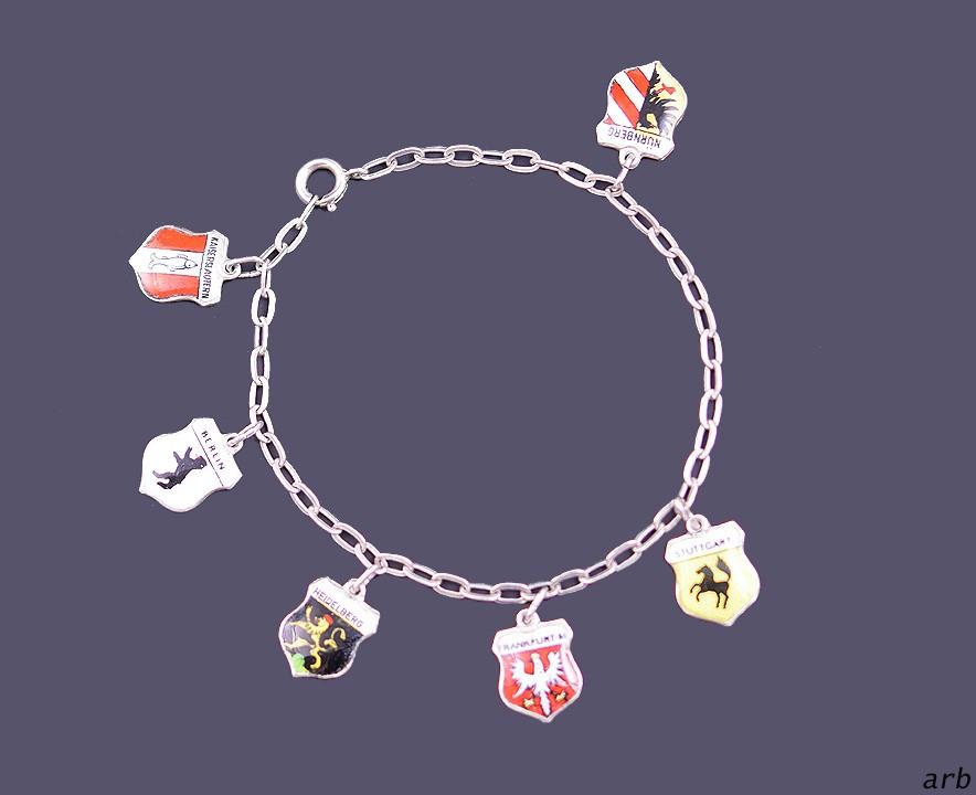 Presented is a fine silver and enameled charm bracelet featuring 6 charms that are of German places.