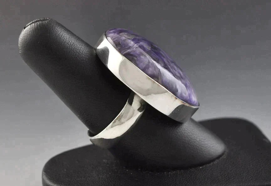 Presented is a lovely silver and genuine purple charoite ring. The ring is sterling silver and stamped as such.The charoite has a great purple marble look to it.