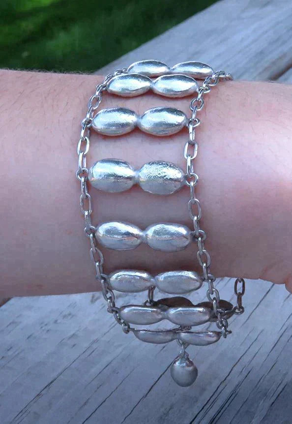 Presented is a lovely chain bracelet decorated in sterling silver coffee beans! Do you grind your own beans? Do you make your own pour over every morning? Got drawers jammed with keurig cups? If you need your Joe to make you go, if you are a barista, or brake for macchiato, frappuccino, or even if you only like the smell of coffee, you will love this accessory. This bracelet is well made and is substantial in weight so that it drapes beautifully and has a lovely bright sheen. There's a bit of texture to the "beans", giving the piece a nice, artisan look and feel. It's also got a good hook and loop catch that's secure and easy to manage.