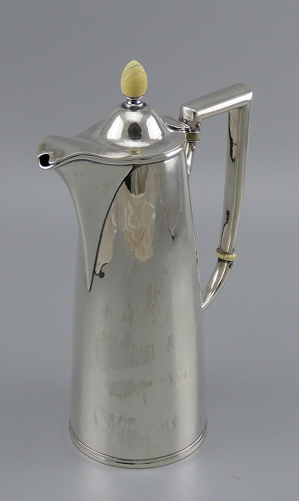 Presented is a vintage, sterling silver lighthouse style tapering demitasse pot or coffeepot made by James Woolley during the early 20th century. This piece is done in an American Arts and Crafts hand hammered style, with inspiration from 18th century pieces. The pot has never been monogrammed and the finial is bone.