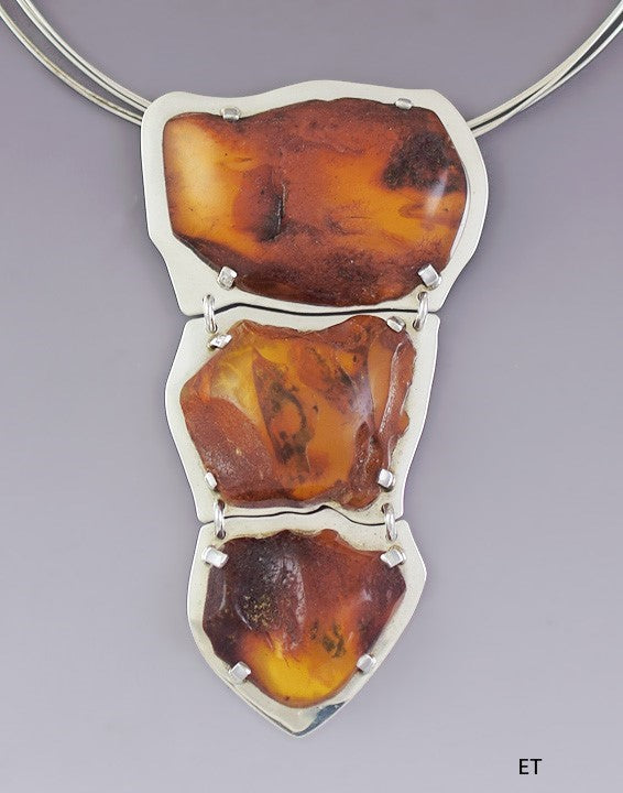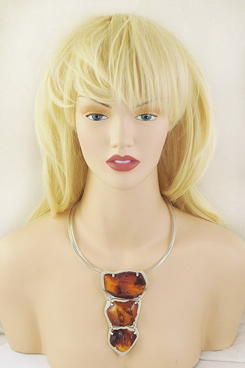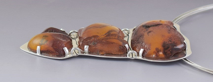 Presented is a fabulous sterling silver and amber necklace. This is a relatively modern piece, though we do not know where it was made. The focal point of the necklace is a large pendant portion consisting of three individual pieces, each prong set with a large piece of amber. The amber pieces are very minimally polished and in their natural irregular shapes, with the sterling silver settings custom made to fit. The pendant portion is permanently attached to a necklace consisting of 5 silver wires, ending in a simple hook style clasp. The necklace is quite striking with its large amber pieces and artistic design. The amber is real, tested in an unobtrusive location with a hotpoint burn test.