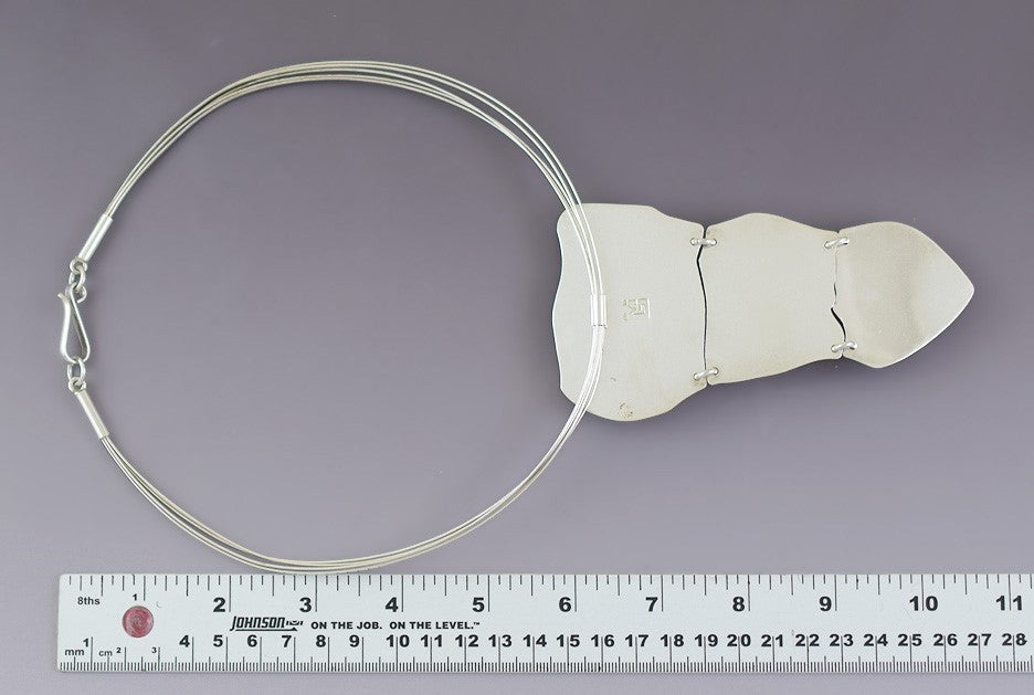 The pendant portion measures about 5 inches long and is about 2 1/2 inches wide at the widest point. The necklace itself is hard to measure in length, without bending the wires out of round, but it's a good size and should fit most necks.