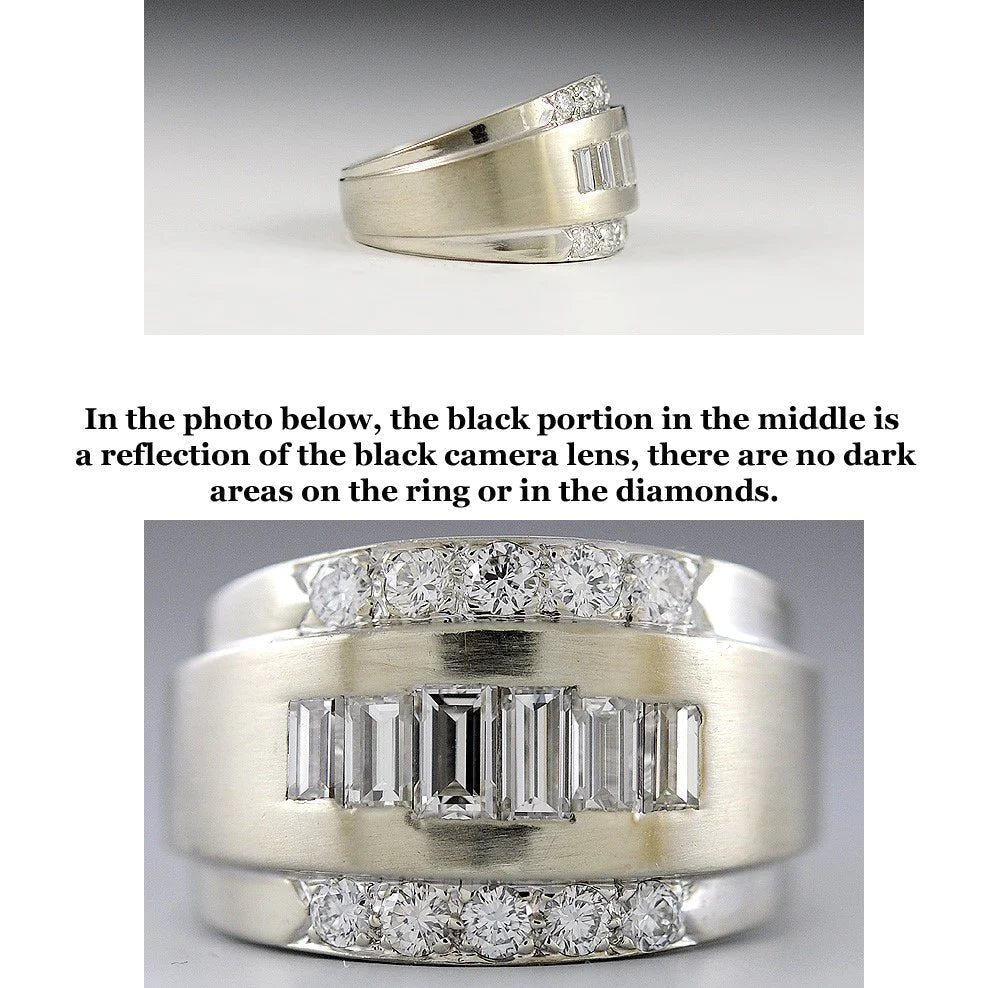 Presented is a large, heavy 14 karat white gold and diamond ring. This is a very handsome piece and is so heavy that it feels like platinum purity even though it is 14K gold. The center of the ring is securely channel set with 6 emerald cut diamonds. The diamonds in the center row are incredible quality stones, at VVS clarity and E-F-G color. The other diamonds in the ring are modern brilliant cut stones and are VS clarity and H color. There is at least 1 1/4 carats in total diamond weight in this ring, there is approximately 75 points in diamonds just in the center row and about 60 points in total for the brilliant cut stones. The ring is a size 7 1/2.