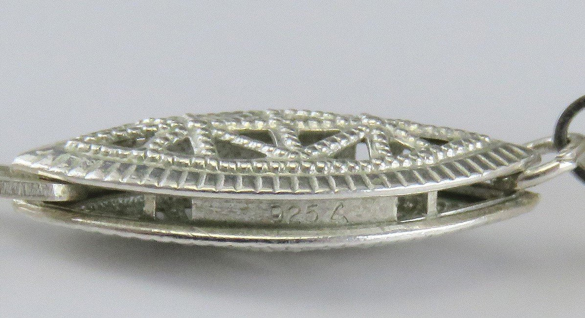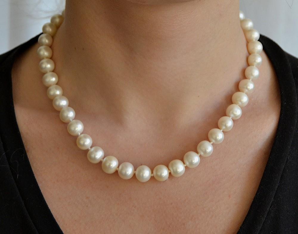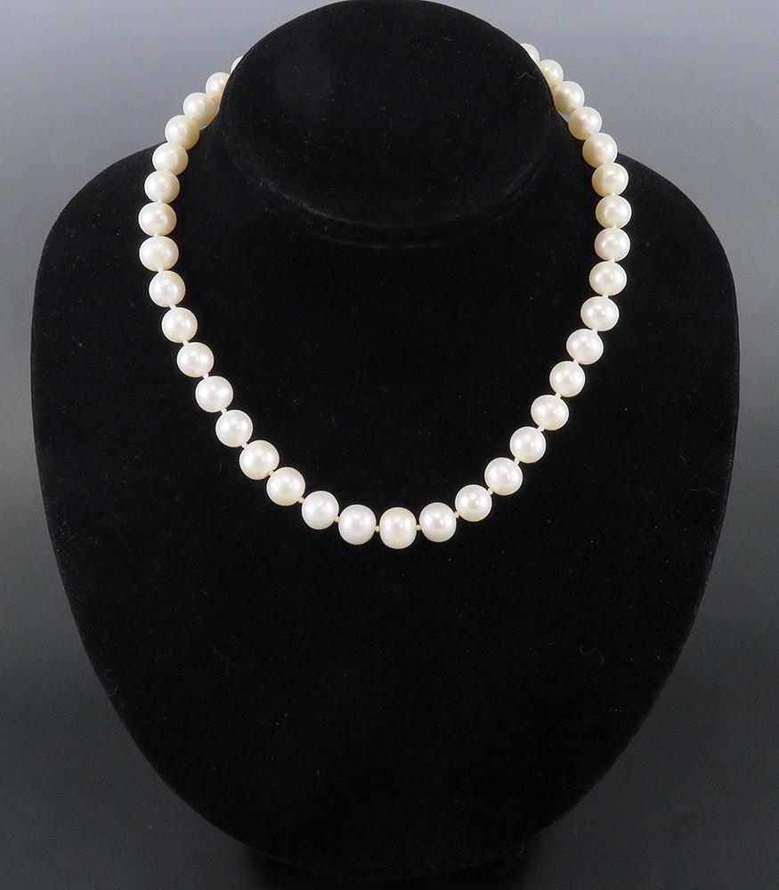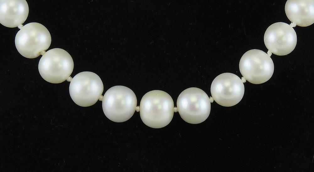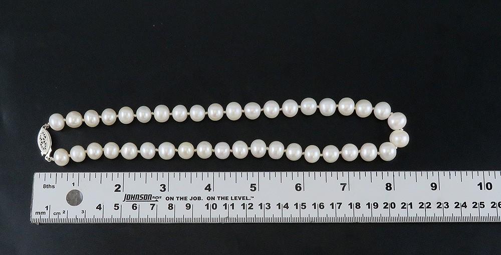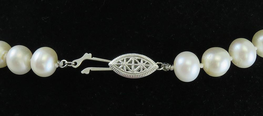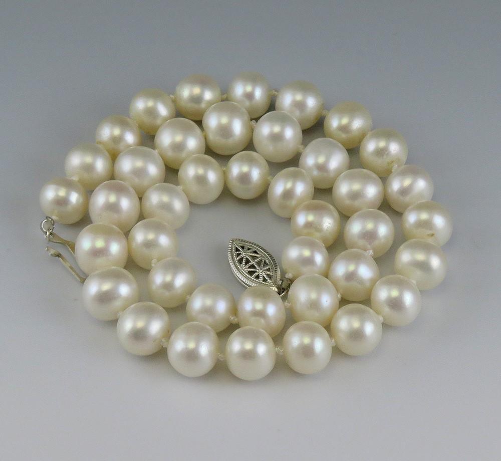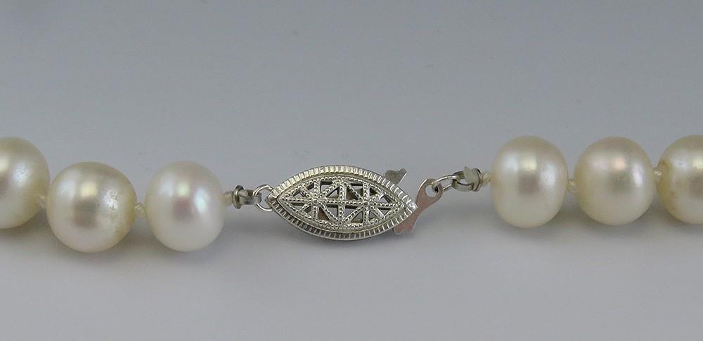 Presented is a classy single strand pearl necklace, with sterling silver clasp. The pearls are more baroque than round, and measure about 9.5 to 10 millimeters. The pearls are well matched in color, with nice lustre and orient, and are individually knotted. The clasp is a hook/plunge style, done in beautiful silver filigree design.