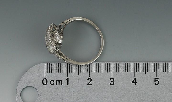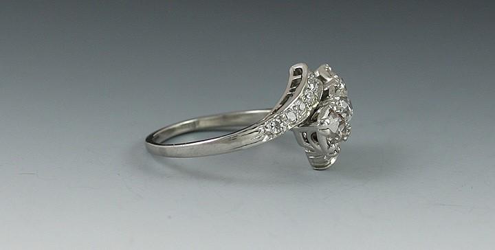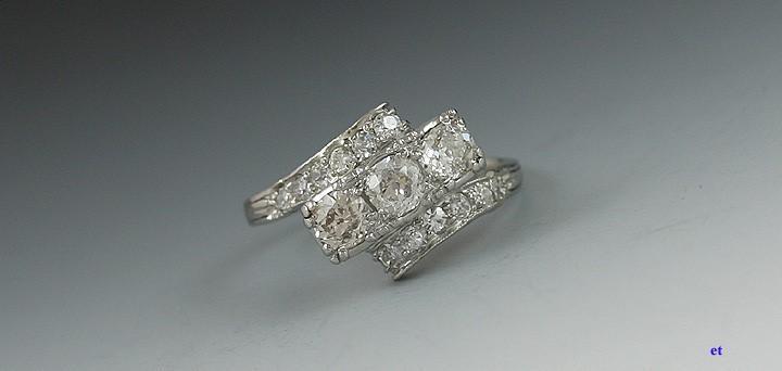 Presented is a stunning platinum and diamond crossover style ring. The band is bead set with 12 diamonds. Eleven of the 12 are single cut diamonds and one is a modern brilliant cut diamond that was likely a replacement. The three large center diamonds are all old mine cut diamonds, all at least 45 points each, but more likely 50 points or 1/2 a carat each. Two of the 3 larger diamonds are I